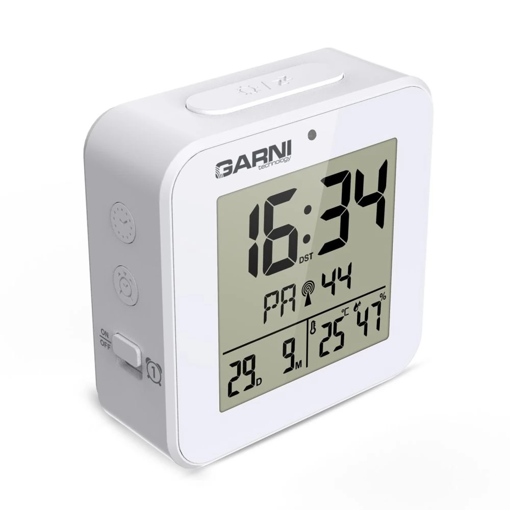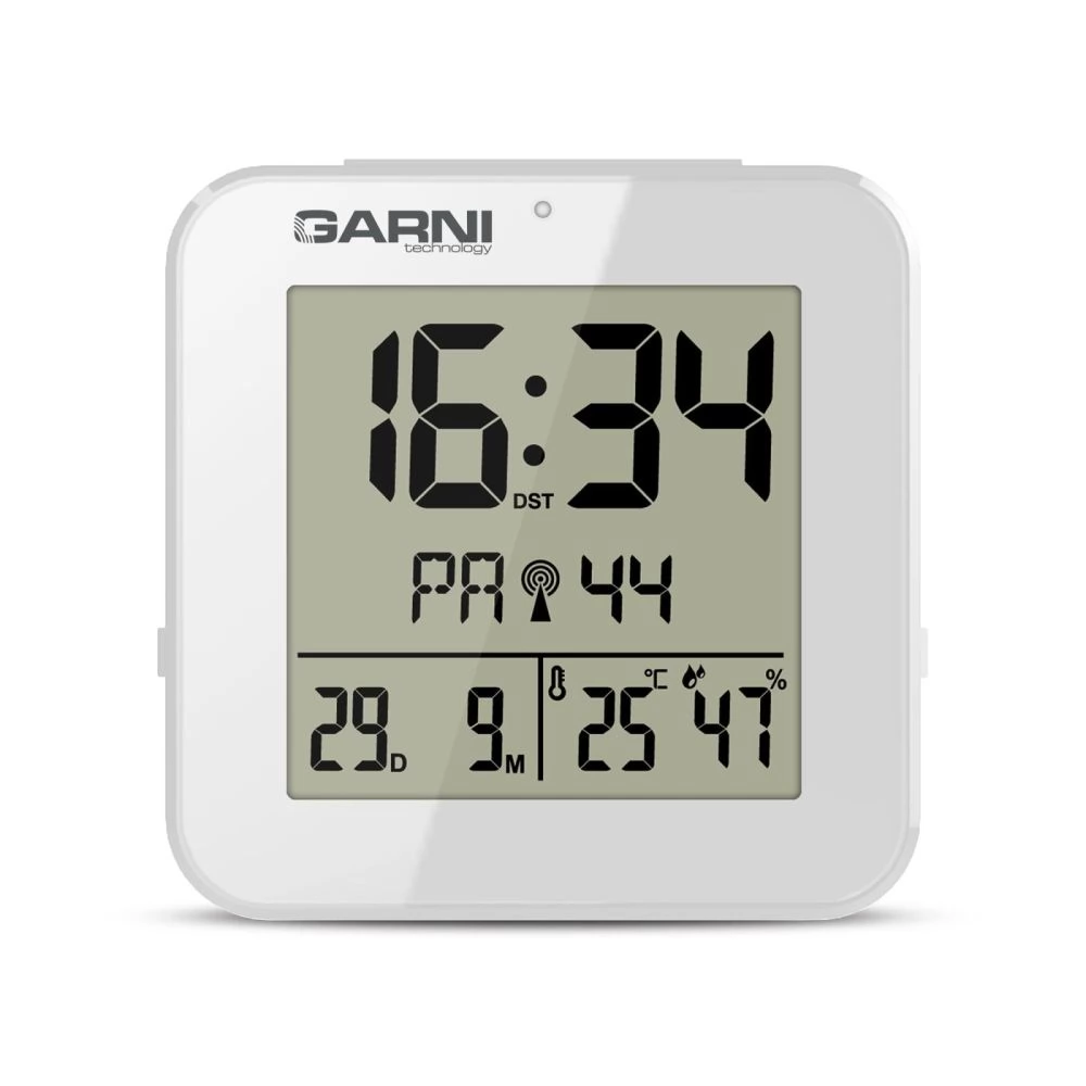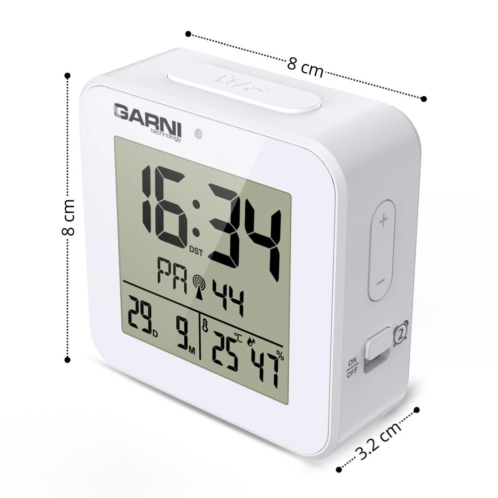 A GARNI 138B egy modern, kompakt digitális ébresztőóra, amely nemcsak pontos időt mutat, hanem beépített hőmérővel és higrométerrel is rendelkezik. Automatikus éjszakai világítása gondoskodik a kényelmes olvashatóságról sötétben is, míg az időt a DCF-77 rádiójel automatikusan szinkronizálja a maximális pontosság érdekében. A 8 másodpercig világoskék háttérvilágítással rendelkező LCD kijelzőn jól láthatóan jelenik meg az idő, a dátum, a hőmérséklet, a páratartalom és az ébresztési idő.