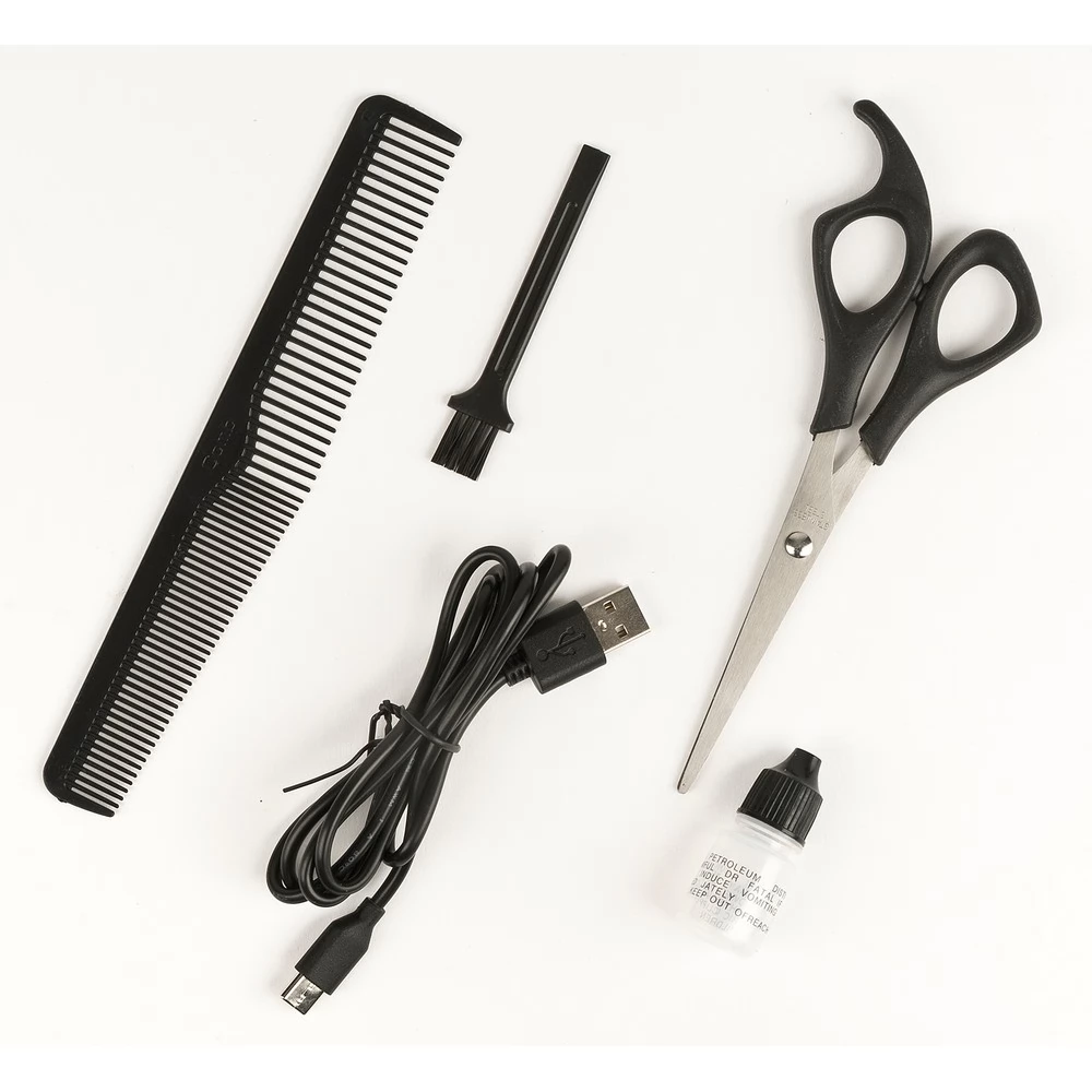 5. Teljes tartozékkészlet – 4 fésű (3–6–9–12 mm), olló, fésű, olaj és USB-kábel.