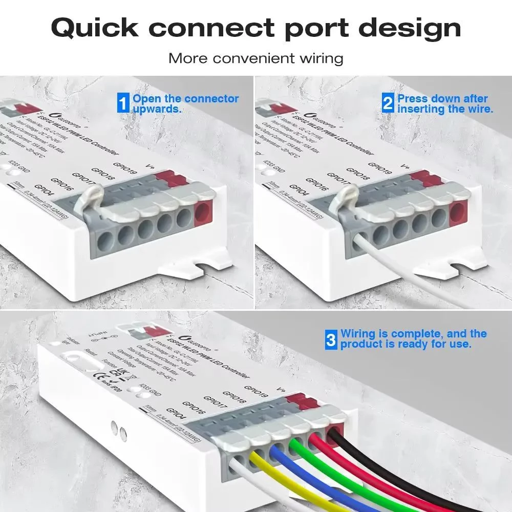 - Sokoldalú LED szalag kompatibilitás: Széles körben támogatja az analóg LED szalagokat, beleértve az RGB, RGBW, RGBCCT, CCT és egyszínű dimmereket, rugalmas világítási konfigurációkat biztosítva.