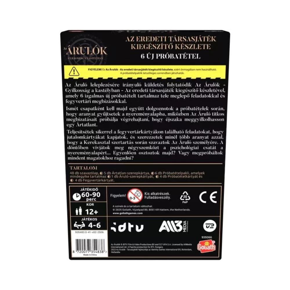 Tedd még izgalmasabbá a kastély titkait és árulásait a kiegészítő szettel! Ez a csomag hat új próbatételt tartalmaz olyan feladatokkal, amelyek új fordulatokat visznek a játékba, és lehetőséget adnak arra, hogy még jobban megméressétek a stratégiát és az éles helyzetek kezelését. A játékosok együttműködve próbálják gyűjteni az aranyat a nyereményalapba, miközben az Áruló titkos akciókat hajthat végre éjjel, hogy elrejthesse valódi kilétét. A fegyvertárból kiválasztott kártyák segíthetnek védelmet szerezni vagy extra előnyt nyerni, amelyek kritikus típusú döntésekké válnak a játék során. A cél továbbra is az, hogy a legtöbb arany begyűjtői lépjenek be a végjátékba – de most akár az Áruló is győzhet, ha ügyes stratégiával vezeti végig a rejtett játszmát.