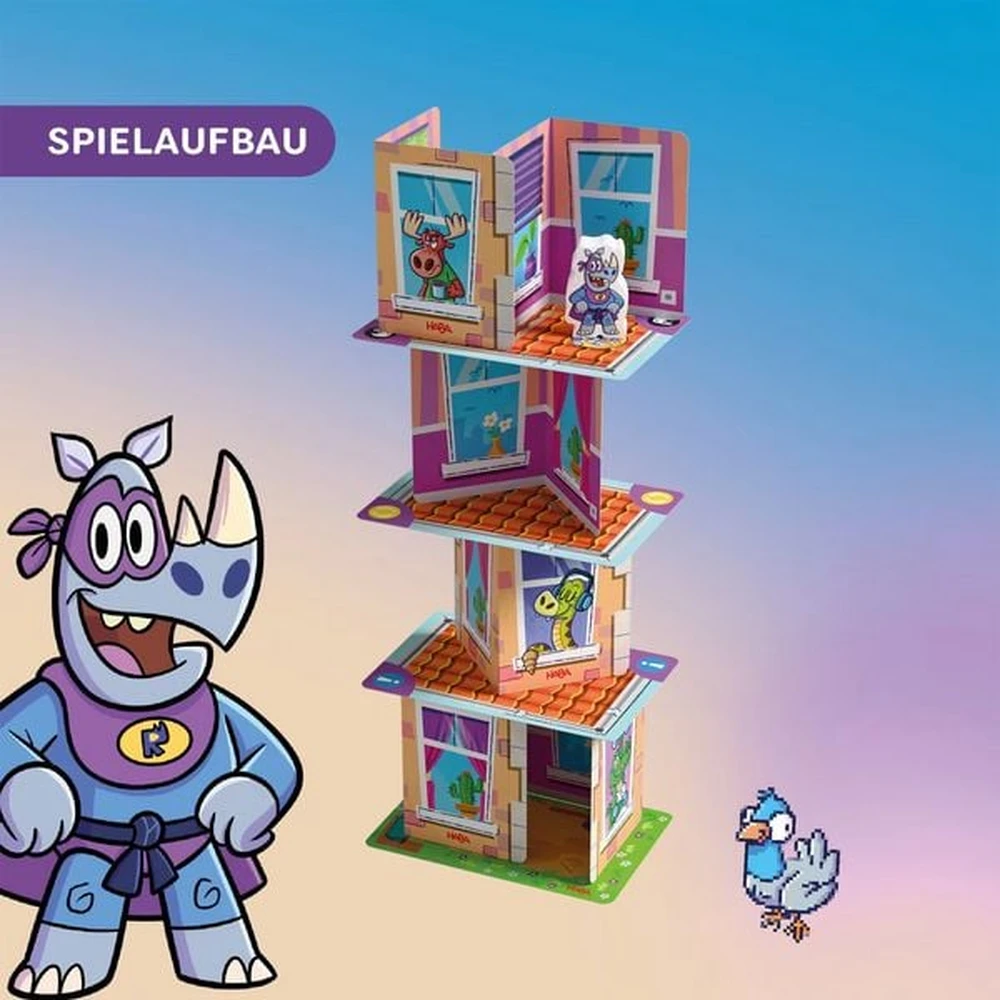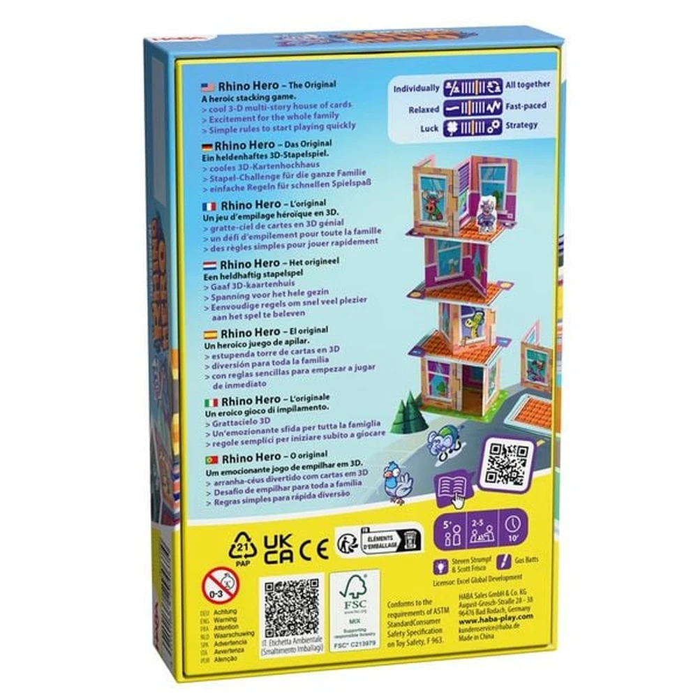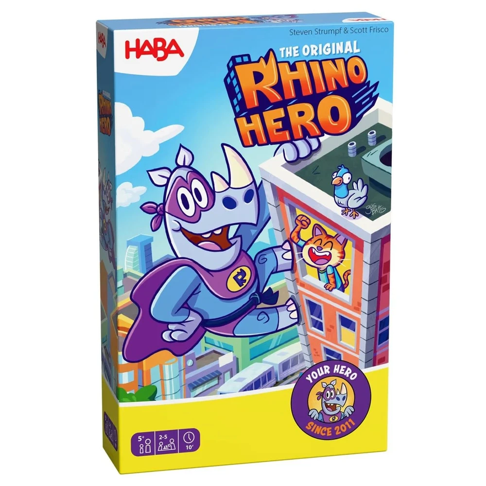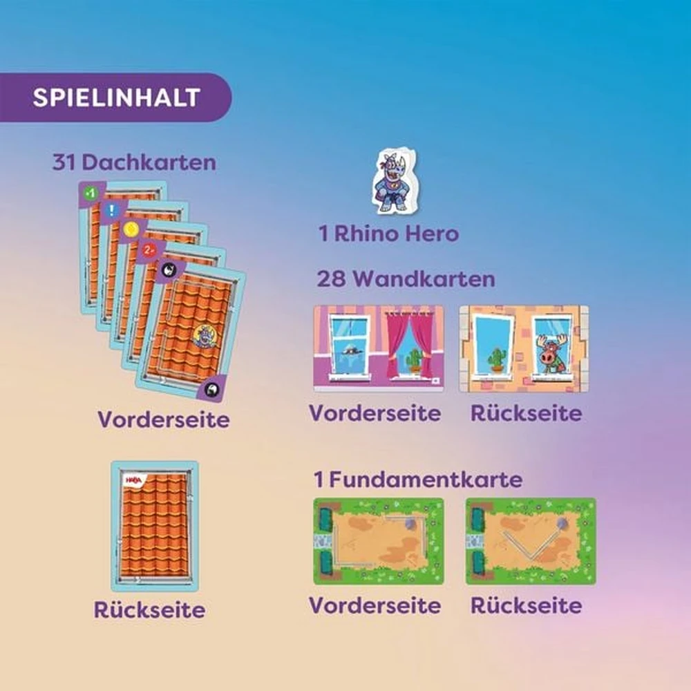 A Rhino Hero egy izgalmas és ügyességet igénylő kártyaépítő társasjáték, amelyben a játékosok felváltva emelnek falakat és padlókat, hogy egyre magasabb épületet hozzanak létre. A nehézkes orrszarvú hős minden emeletváltásnál új kihívás elé állítja a játékosokat.