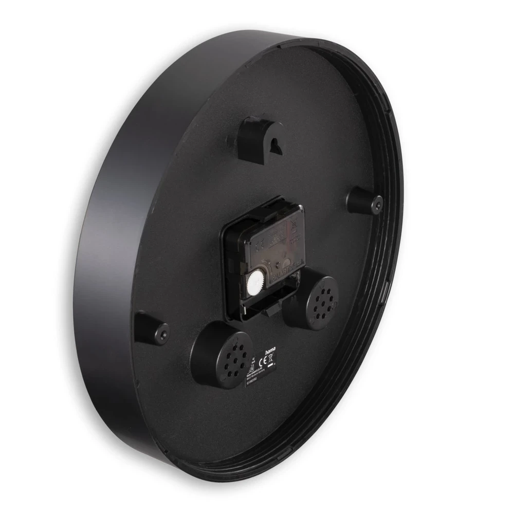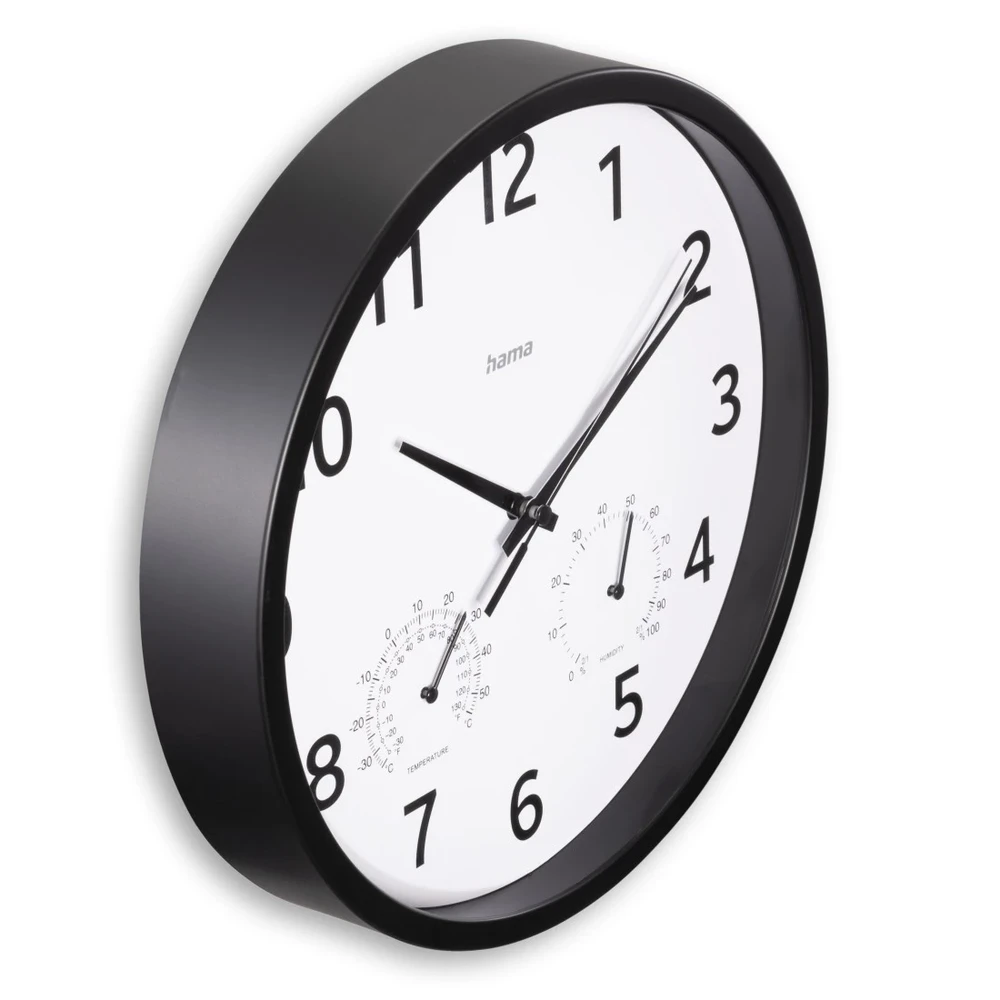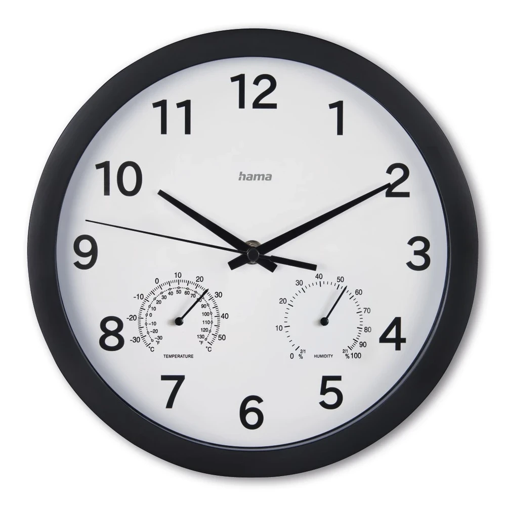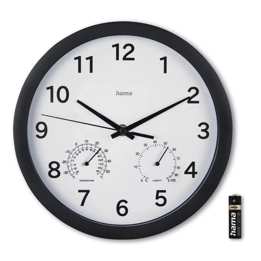 Hangtalan 25 centi átmérőjű fali óra hőmérséklet és pára méréssel.