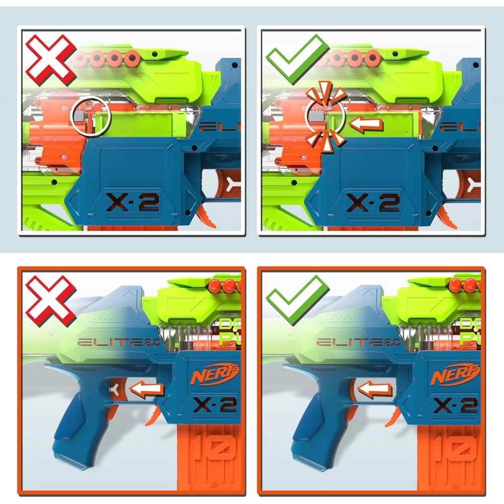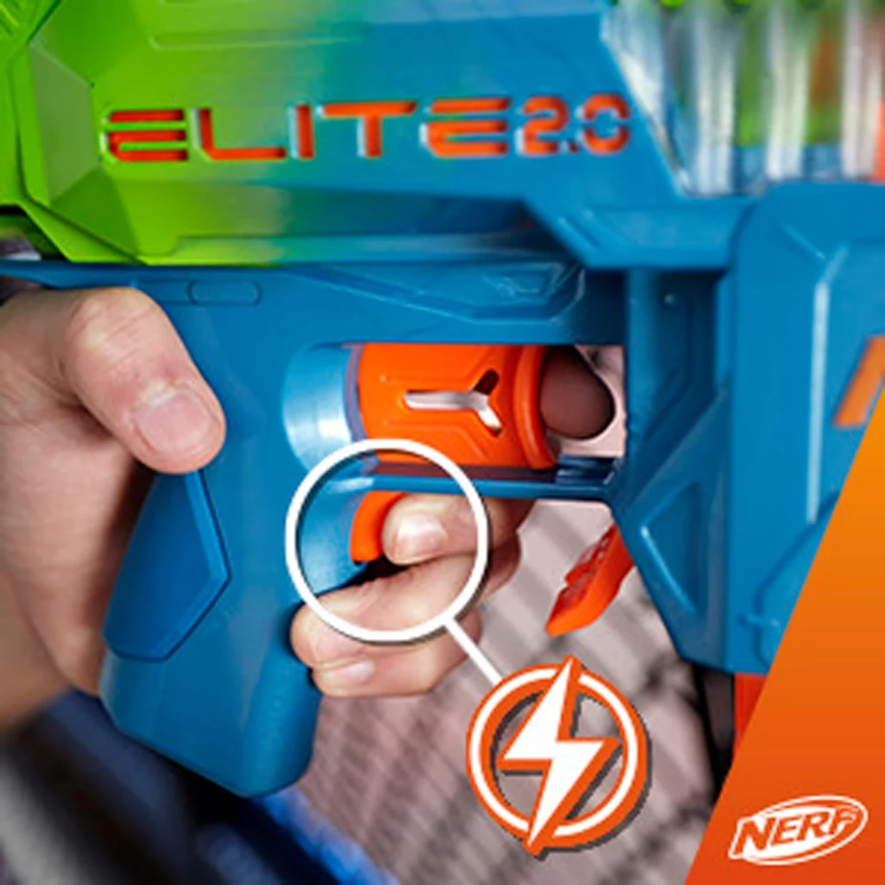 A Nerf Elite 2.0 Double Punch motoros szivacslövő fegyver dupla tárral és dupla csővel, melyek lövéskor egy löveghez hasonlóan előre-hátra mozognak. A fegyverhez 50 darab töltény kapunk, a dupla tárol felül (2x 10 darab kapacitás) a fegyver felső részéébe helyezhetünk tartalék lőszert. Fontos, hogy figyeljünk arra, hogy a tárak megfelelően legyenek behelyezve, különben elakad a lőszer.