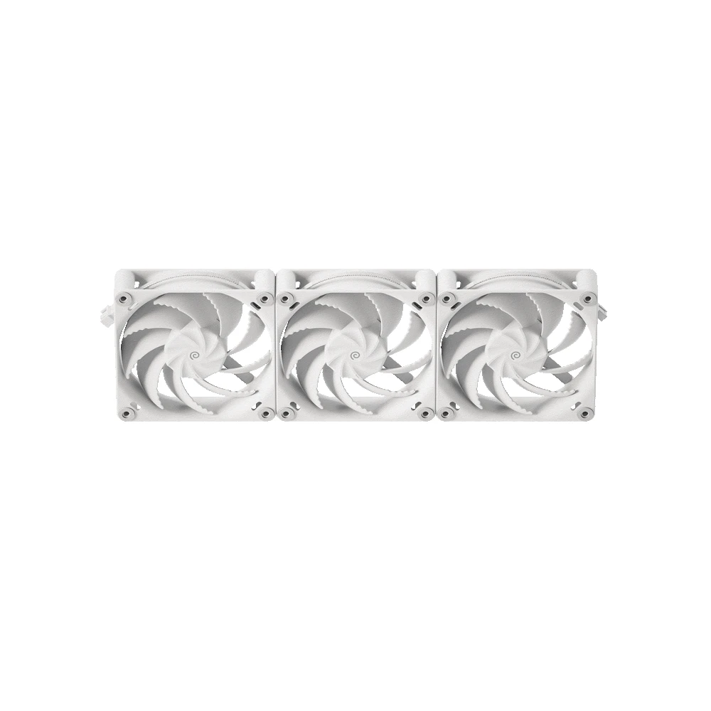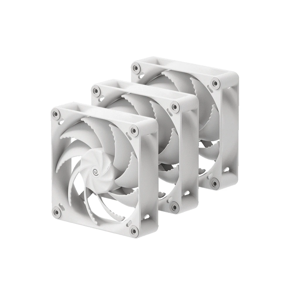 3 darab 120mm-es (30mm vastag) házhűtő ventilátor PWM sebesség szabályzással, egyedi lapát kialakítással (hatékonyabb légáramlás és kisebb turbulencia), rejtett kábellel és rezgéscsillapítós felfogatókkal.