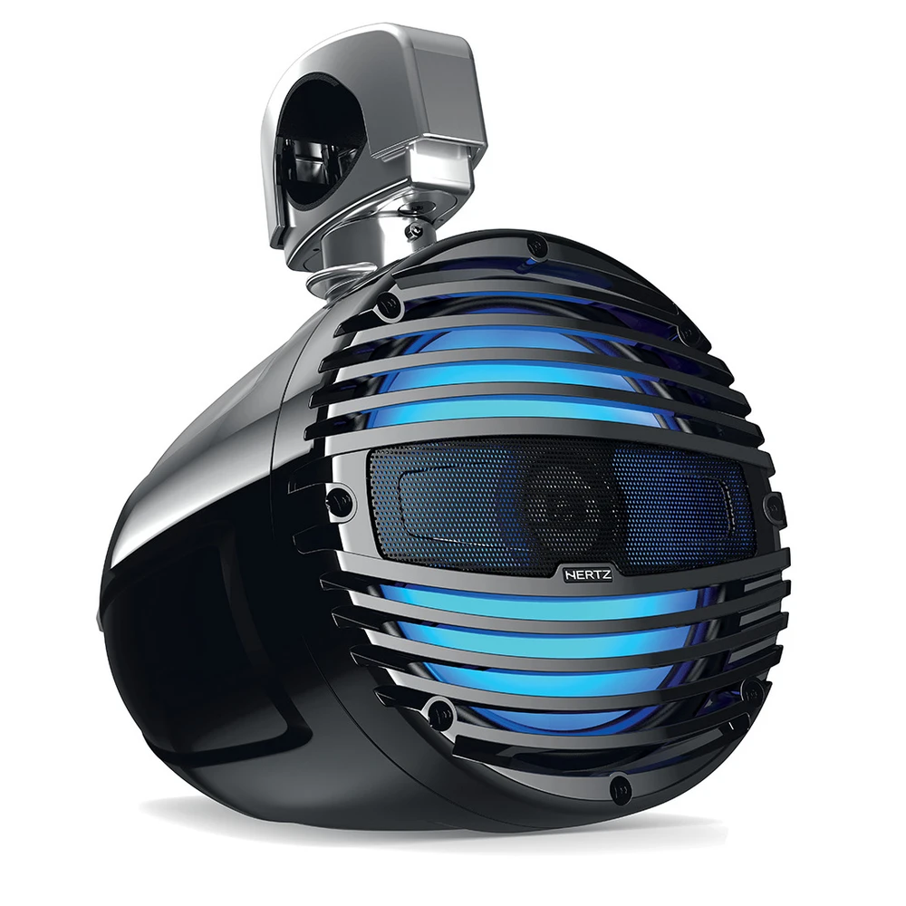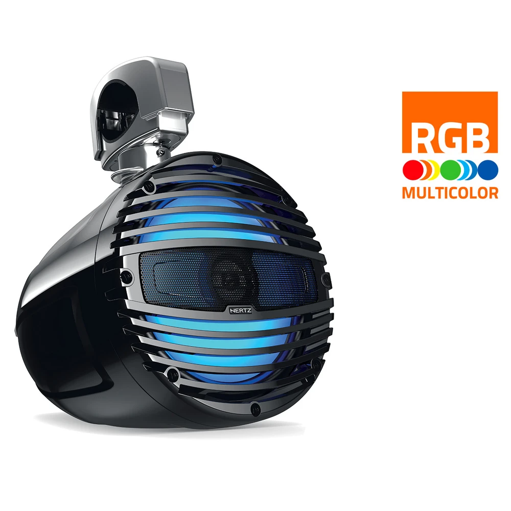 A Hertz Marine Towers lenyűgöző hangzásával és teljesítményével a HTX 8 M-CL-TC felejthetetlenné teszi a vízi sportok élményét és a hajós kirándulásokat. A hangszóró háza, az elülső rács és a magassugárzót takaró fém rács azonos színű fényezése egységes, letisztult megjelenést kölcsönöz. Az erős 316-rozsdamentes acél bilincs ideális olyan kerek vagy négyszög profilú wakeboard toronyhoz, ahonnan a hang könnyen irányítható, jól hallható, Ez a Q-OS² (Quick Orientation & Release for Sound & Safety – Gyors irányíthatóság a stabil hangzás érdekében) szabadalomnak köszönhetően. A 20 cm-es mély-hangszóró és a 36 mm-es dóm magas-sugárzó 200 W maximális teljesítmény leadására képes, IP 65 vízállósága maximális védelmet biztosít. A védőrácsba épített RGB LED világítás igazán cool megjelenést kölcsönöz a hangszórónak, ami a HM RGB 1 BK vezérlővel tetszőleges színre, vagy akár a zene ütemére változó színkavalkád módra állítható.