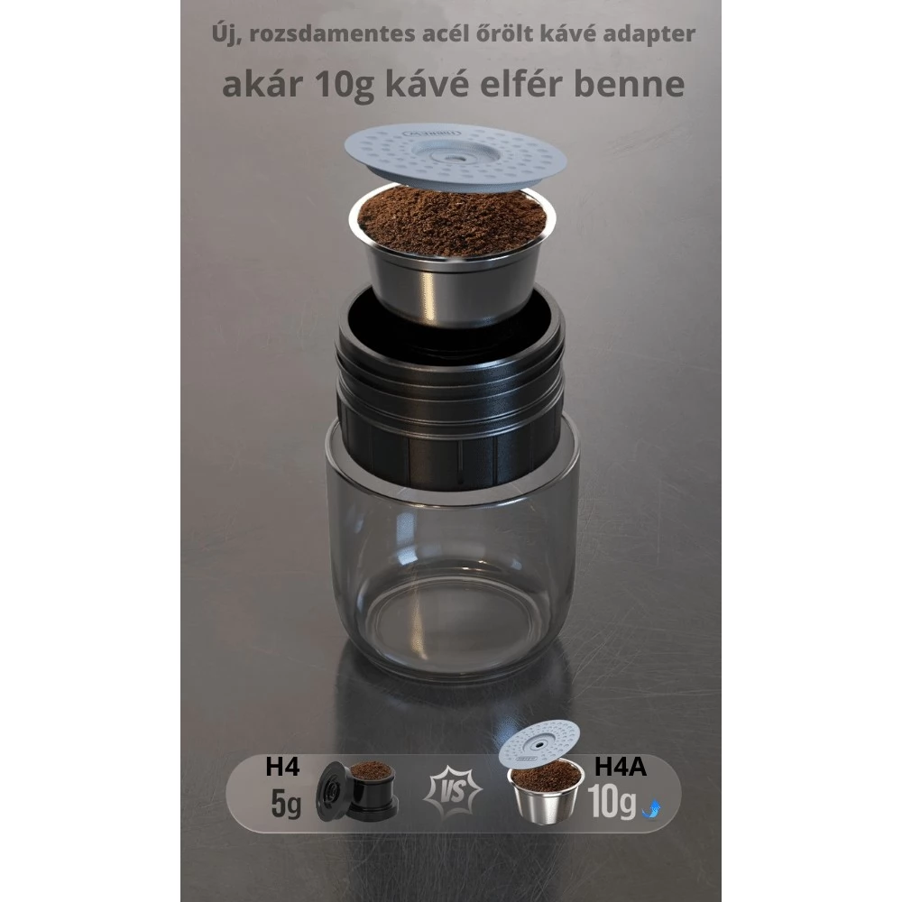 USB kábel használata esetén forró vizet kell beletölteni, mert ebben a módban nem melegít, illetve hideg kávét készíthetünk jegeskávéhoz. Hordtáskájában tárolhatja a készüléket és tartozékait. A hozzáadott teleszkópos állvánnyal még kényelmesebb a kávéfőzés, magasabb poharak és csészék is elférnek a H4A alatt.