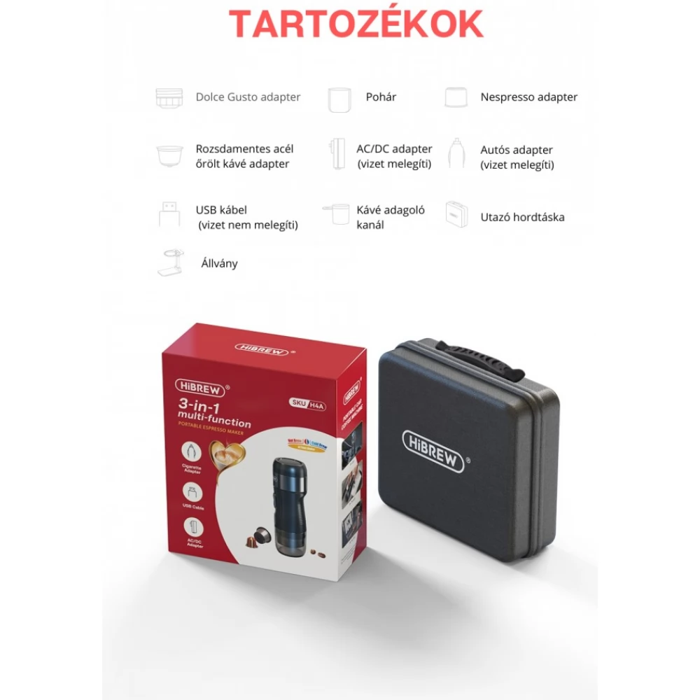 - Minden H4A-hoz három tápforrás: AC/DC hálózati adapter, autós (szivargyújtó) adapter, USB kábel powerbankhoz (az USB kábel használatakor a H4(A) nem melegíti a vízet)