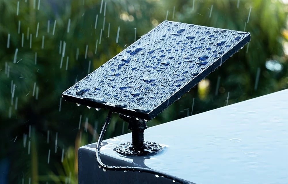 A panelhez tartozik egy 3 méteres USB-kábel a gyors és egyszerű csatlakoztatás érdekében a kamerához, amely megszakítás nélküli töltést biztosít a kamera eltávolítása nélkül. A vízálló kialakítás megbízható működést tesz lehetővé minden időjárási körülmény között, még heves esőzések vagy hóviharok idején is.