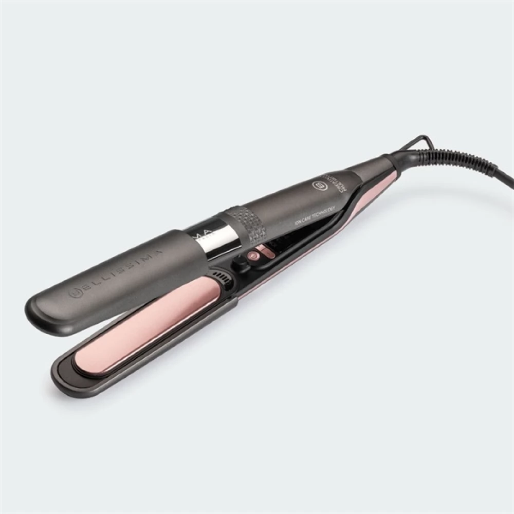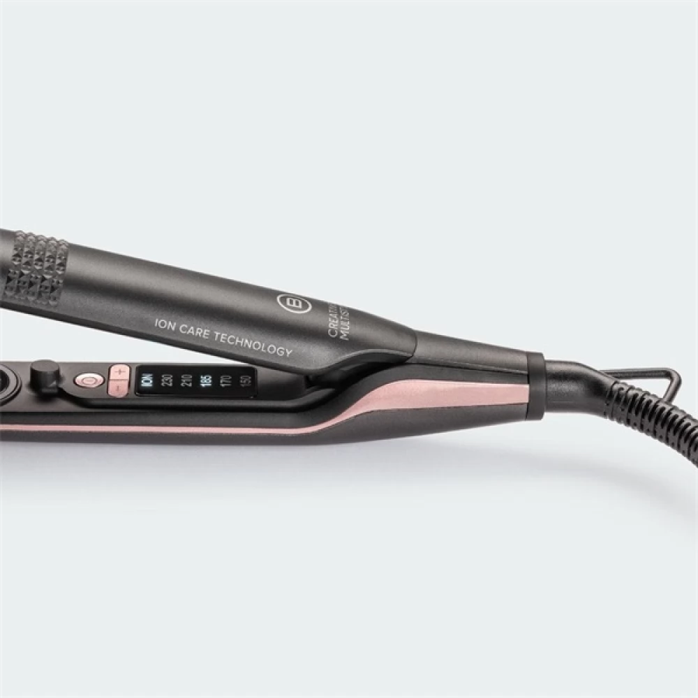 Imetec 11876 Bellissima Creativity Multistyle hajsimító, fekete ION technológiával ellátott, teljeskörű felmelegedés, azaz hajsimító külső felülete is felmelegszik, hogyha úgy kívánja az egyenesítés helyett hullámosíthassa haját, hullámosításra is alkalmas, hőszabályozási technológiával ellátott, gyémánt és keratin kerámia bevonatos, hogy megvédje haját a hőtől, szép és egészséges maradjon, rugalmas lemezek, amelyk pontosan illeszkednek az ön hajához, és a megfelelő nyomást fejtik ki, hogy az első mozdulat után láthassa az eredményt, hőmérséklet szabályozó, amellyel öt különböző hőmérsékletet lehet beállítani 150°C-170°C-185°C-210°C-230°C, max hőmérséklet 230°C, LED kijelző, gyors felmelegedés, automata kikapcsolás 60 perc után, kábel 2m