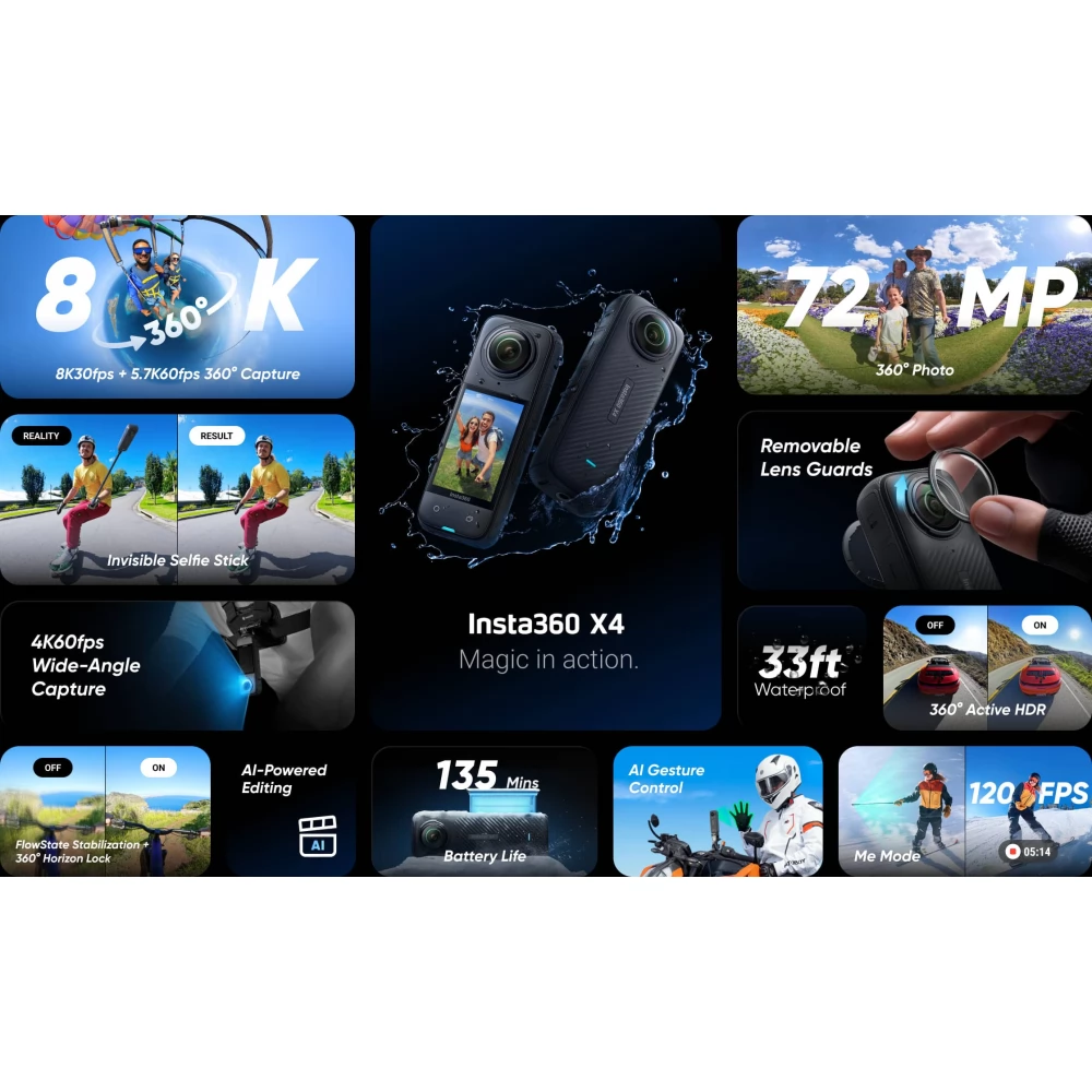 Fedezze fel a korlátlan rögzítési és fényképezési lehetőségeket az Insta360 X4 kamerával! Az akár 72 MP-es fénykép felbontás és a 8K felbontású videó rögzítés lehetővé teszi, hogy minden részletet rögzítsen. Üzemmódok széles választékát kínálja fotókhoz és videókhoz egyaránt, működési ideje pedig eléri a 135 percet. Tökéletes választás filmrajongóknak, utazóknak, vloggereknek és mindenkinek, aki felejthetetlen pillanatokat szeretne a legjobb minőségben megörökíteni.