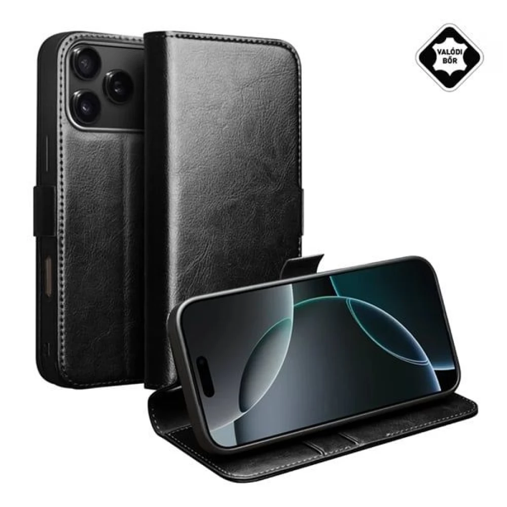 iPhone 17 Pro QIALINO tok álló, valódi bőr FLIP, asztali tartó, FEKETE