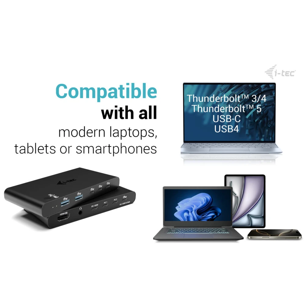 - Egyetlen dokkolási megoldás két gazdagéphez zökkenőmentes váltás a PC1 és PC2 között