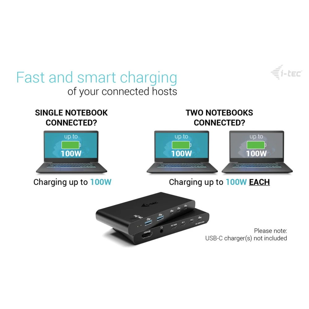 - Kettős tápellátás mindkét csatlakoztatott eszköz töltése (akár 2× 100 W-ig)