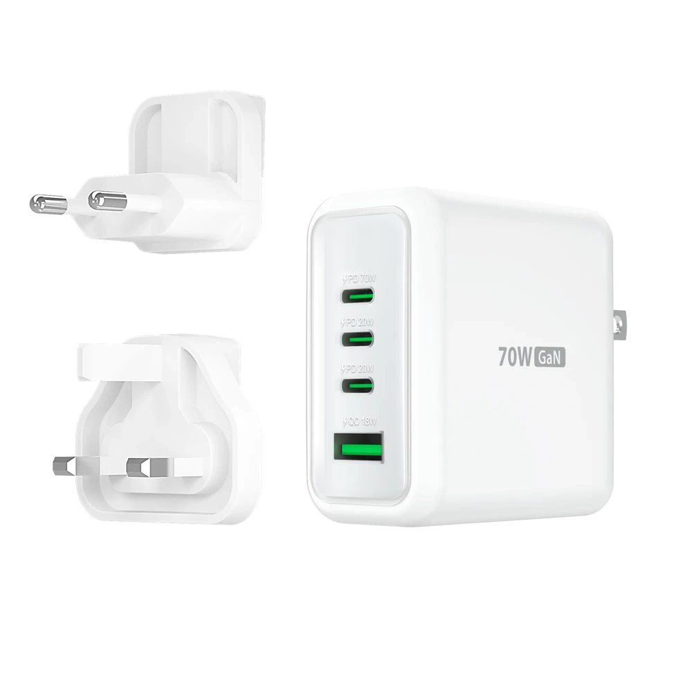 A 70 W-os GaN USB-C® 4 portos töltő egyszerre 4 eszközt képes tölteni. A töltő GaN technológiát használ, amely lehetővé teszi jelentős mennyiségű energia leadását kis méretben.