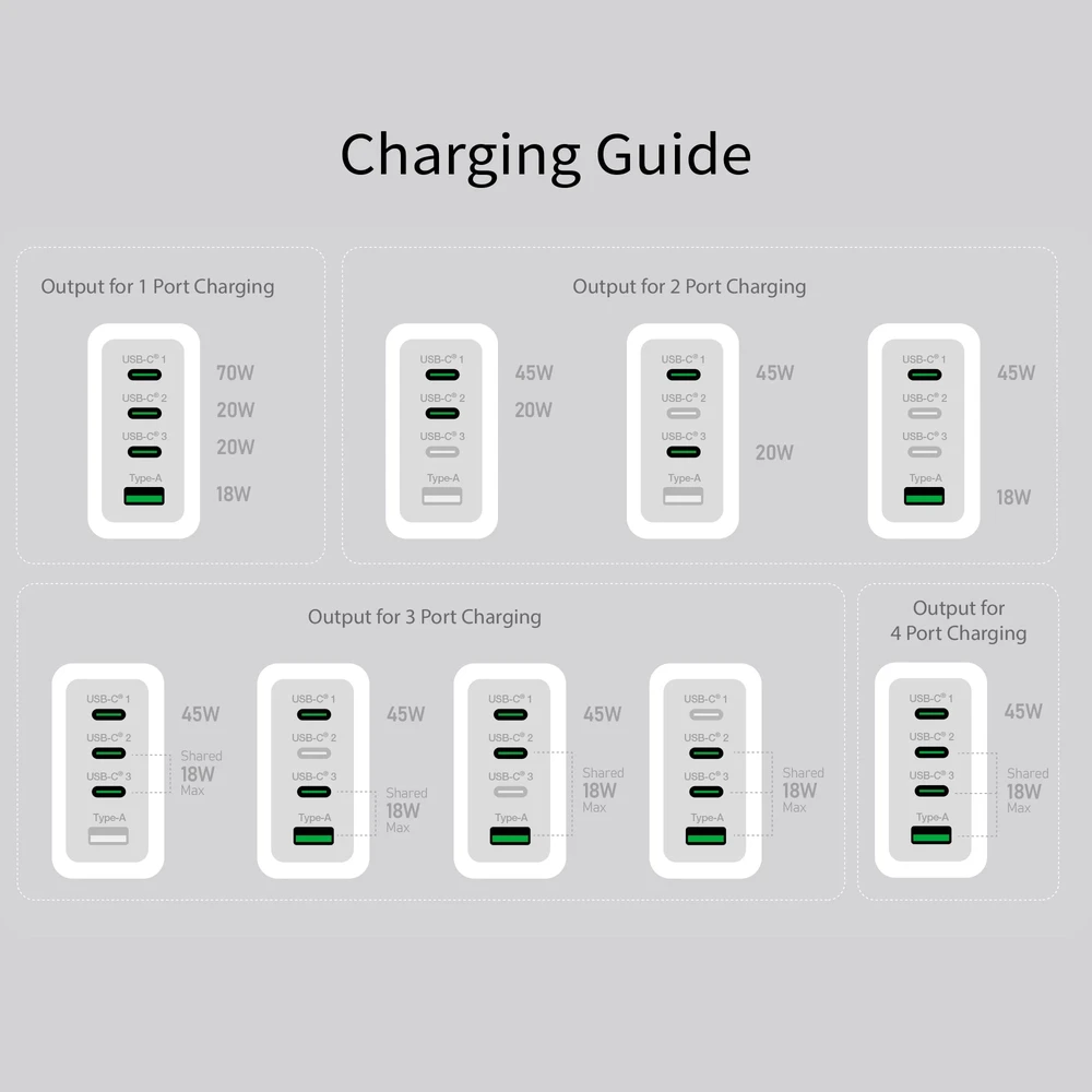 Minden USB-C® port támogatja a Power Delivery 3.0/2.0 technológiát, az USB-A™ port pedig a QC™ 18 W-os gyorstöltést. Ha csak az egyik portot használjuk, az első port akár 70 W-ot is támogat, lehetővé téve a MacBook®, laptopok, táblagépek, kézi játékkonzolok és egyéb mobileszközök lehető leggyorsabb töltését. A második és harmadik port akár 20 W-ot is támogat, ami elegendő egy második táblagép vagy telefon töltéséhez. A termék 45 W-ot tart az első porton, miközben a többi port/portok használatban vannak, így zökkenőmentesen tölthetjük laptopunkat és más eszközeinket egyszerre.