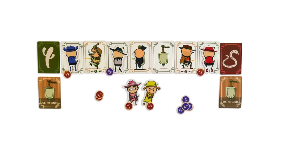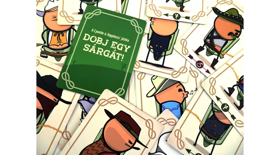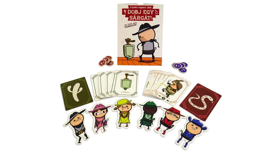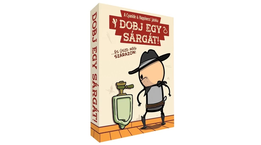 A Dobj egy sárgát! blöffölős partijáték a Joking Hazard – Egy vállalhatatlan kártyajáték kiadójától. Minden partiban eggyel kevesebb piszoár áll rendelkezésre, mint ahányan játszotok, és ezekre kell a cowboy-kártyátokat úgy lehelyeznetek, hogy a szomszédok ne fröcsköljenek le … Sorra kerülve mindenkinek döntenie kell: megles egy cowboyt, akiről aztán el kell mondja, merre céloz (de hazudhat is), megcserélhet kettőt, vagy a fajanszra irányít egy tehenészt. A piszoár nélkül maradt legény csak a combjait szoríthatja össze – és közben reménykedhet, hogy nem lesz célpont!