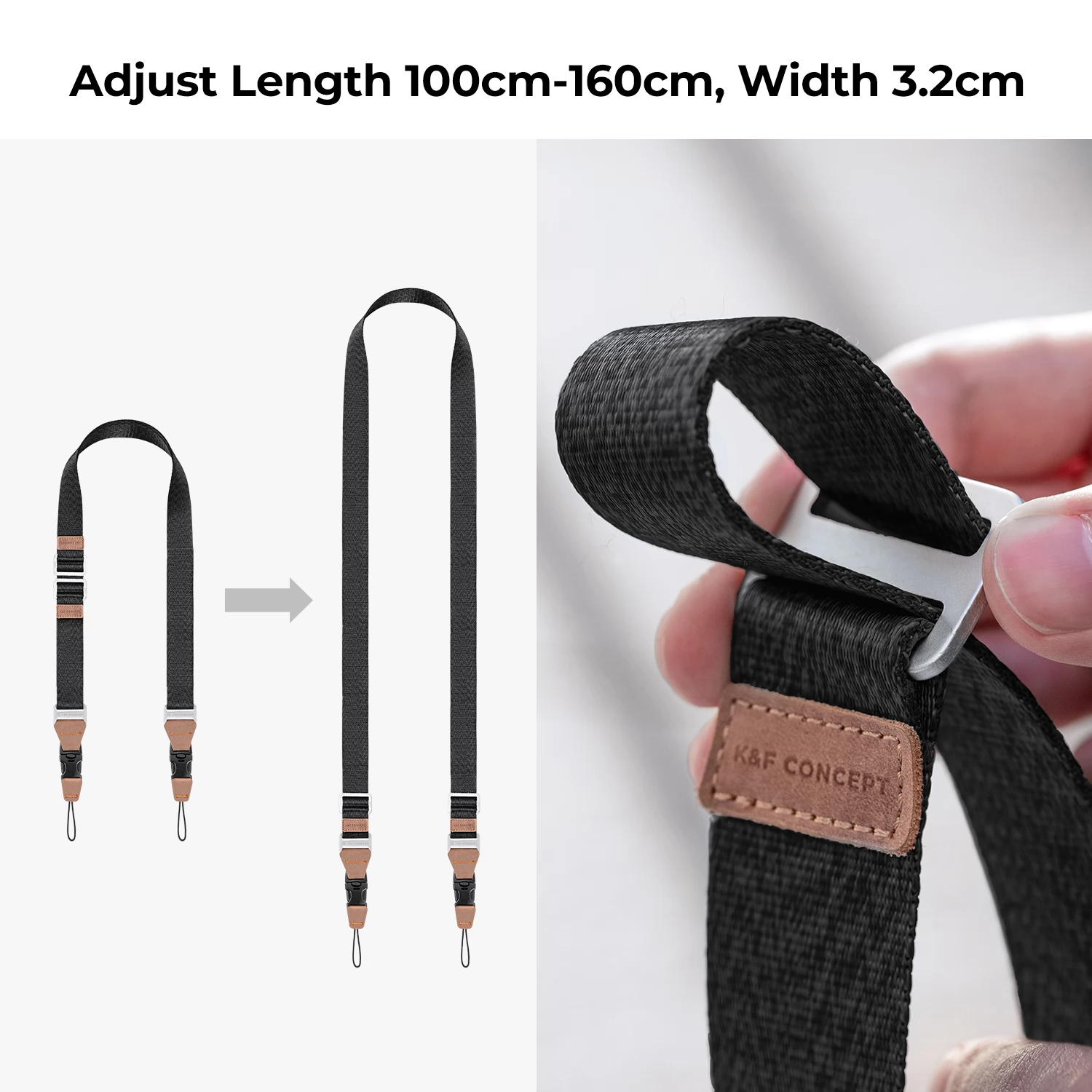 A K&F Concept Camera Neck Strap váll- vagy nyakpántként, illetve keresztben is hordható. Ez a pánt tartós nejlonból készült, és Duraflex márkájú csattal rendelkezik. A csat egyedi zárszerkezettel rendelkezik, amely megvédi fényképezőgépét a véletlen leejtéstől. A hurkok háromrétegű zsinórból készültek. A heveder gyorsan csatlakoztatható és oldható, ha állványt vagy stabilizátort használ.