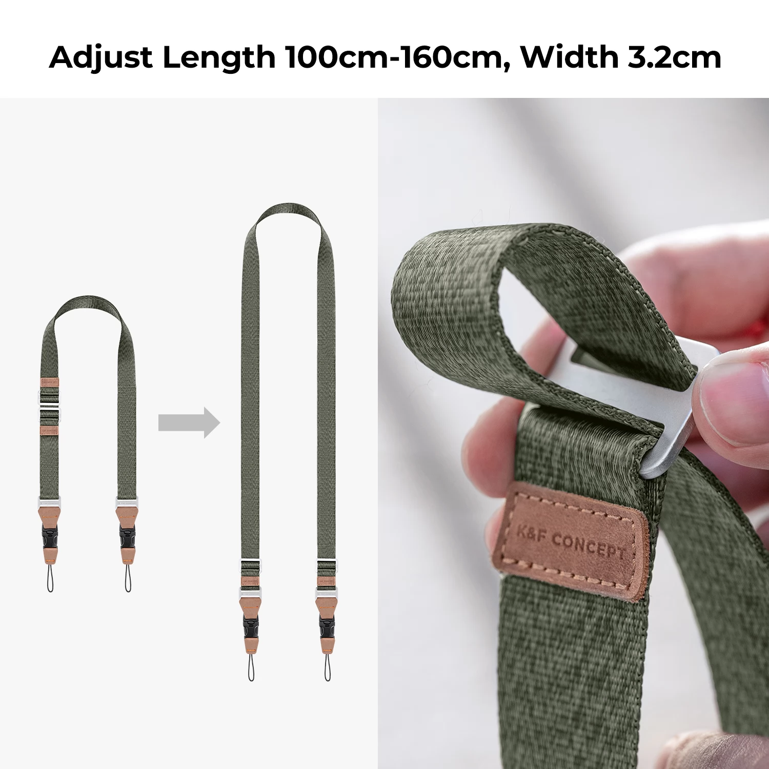 A K&F Concept Camera Neck Strap váll- vagy nyakpántként, illetve keresztben is hordható. Ez a pánt tartós nejlonból készült, és Duraflex márkájú csattal rendelkezik. A csat egyedi zárszerkezettel rendelkezik, amely megvédi fényképezőgépét a véletlen leejtéstől. A hurkok háromrétegű zsinórból készültek. A heveder gyorsan csatlakoztatható és oldható, ha állványt vagy stabilizátort használ.