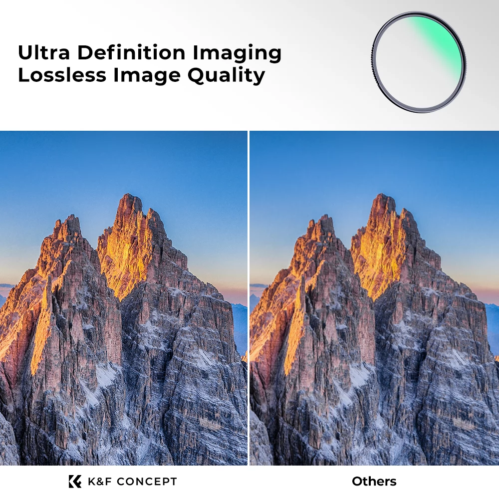 K&F Concept HD UV szűrő kerete 3,3mm-es, dupla oldalsó polírozási technológiával készült. Nincs vignettálás, a képek mindig tiszták és élesek, még a teleobjektíveken is.