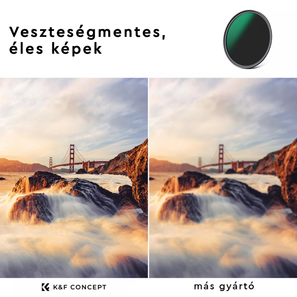A K&F Concept fix ND szűrő készlete egy fix ND8 (3 fokozat), egy fix ND64 (6 fokozat) és egy fix ND1000 (10 fokozat) szűrőből áll, mely alkalmas portrék, tájképek készítéséhez, illetve hosszú expozíciós és változó fényviszonyok mellett készült fényképekhez.