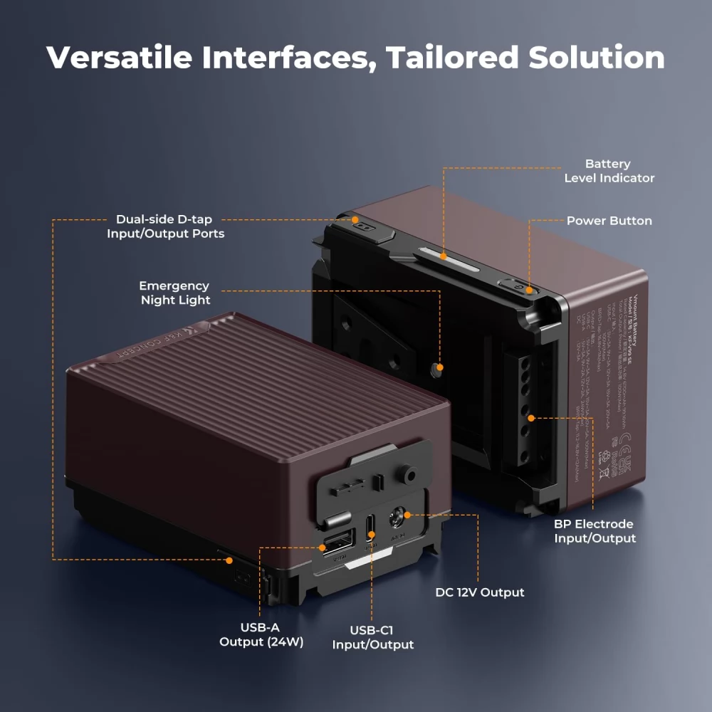 A PD 100W kétirányú gyorstöltés révén az akkumulátor nemcsak gyorsan feltölthető, hanem képes külső eszközöket is villámgyorsan tölteni. Széleskörű kompatibilitásáról a dual D-TAP portok, USB-C, USB-A, 12V (5.5x2.5mm) és BP csatlakozások gondoskodnak, így egyszerre használható professzionális videós felszerelésekkel és hétköznapi eszközökkel, például tablettel, telefonnal vagy laptoppal.