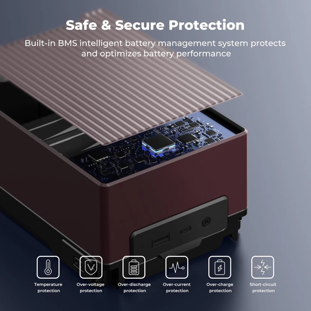 A beépített intelligens BMS rendszer védi az akkumulátort a túláram, rövidzárlat, túlmelegedés és túlfeszültség ellen, biztosítva a megbízható működést minden körülmények között.