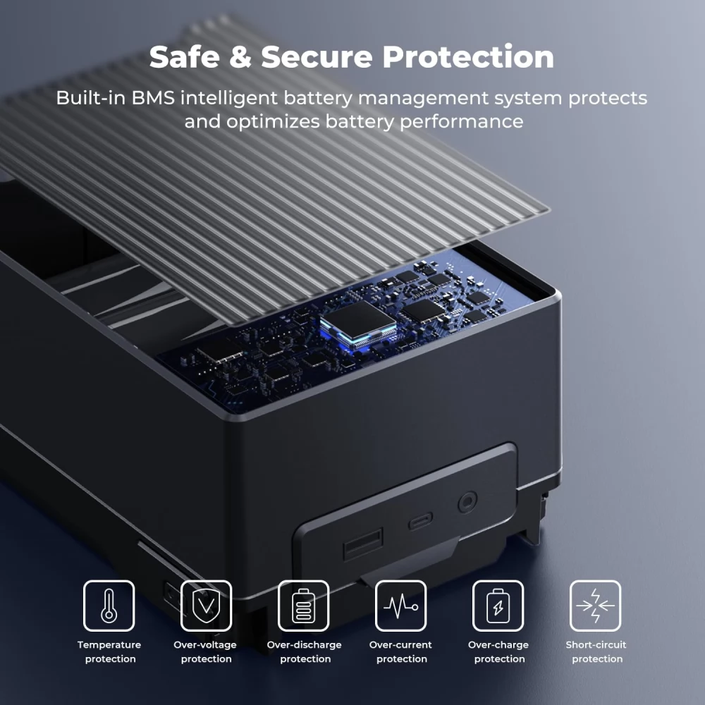 A beépített intelligens BMS rendszer védi az akkumulátort a túláram, rövidzárlat, túlmelegedés és túlfeszültség ellen, biztosítva a megbízható működést minden körülmények között.