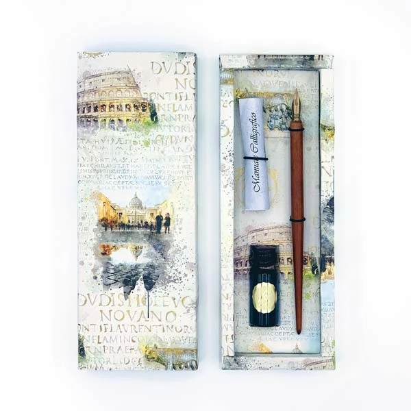Kalligráfia szett díszdobozban. Fa tolltest tollheggyel. Egy üveg 11 ml-es tintával és natúr pergamen tekerccsel.