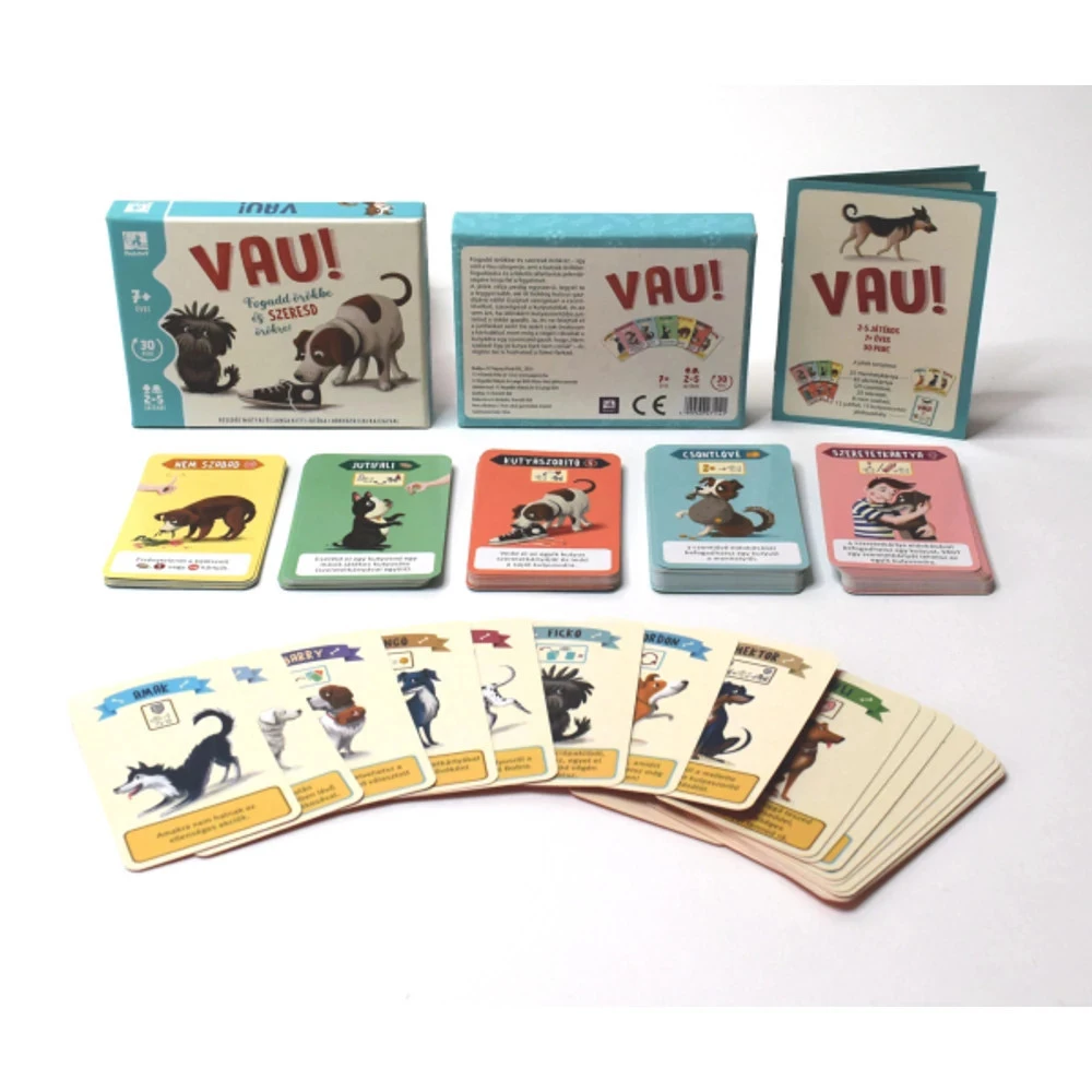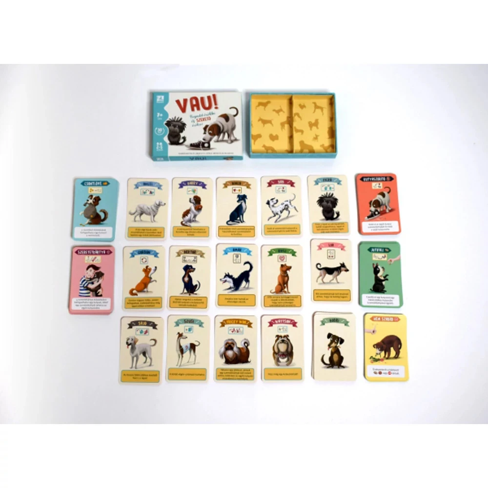 Fogadd örökbe, szeresd örökre! – ez a Vau szlogenje, amely a kutyák örökbefogadásának fontosságára és a felelős állattartásra hívja fel a figyelmet.A játék egyszerű, mégis izgalmas: te legyél az első, aki öt boldog kutyusnak ad szerető otthont! Gyűjtsd a csontlóvékat, kényeztesd a kutyusaidat, és ne habozz néha kisebb kalamajkába keverni a többi gazdit sem. És persze ne spórolj a jutifalikkal! De figyelj a kártyákra – egy rossz húzás, és a szomszéd gazdi máris rákiált a kutyusodra: „Nem szabad! Egy jó kutya ilyet nem tesz!” – és akkor neked is ideje visszafogottan viselkedni.