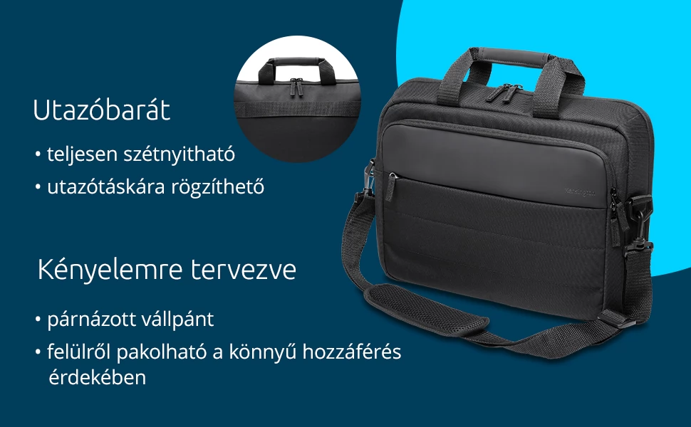 Párnázott vállpánt a nyak és a váll kényelméért, rögzítőpánt guruló poggyászhoz való egyszerű rögzítéshez. A teljesen szétnyitható kialakítás leegyszerűsíti a biztonsági átvizsgálást.