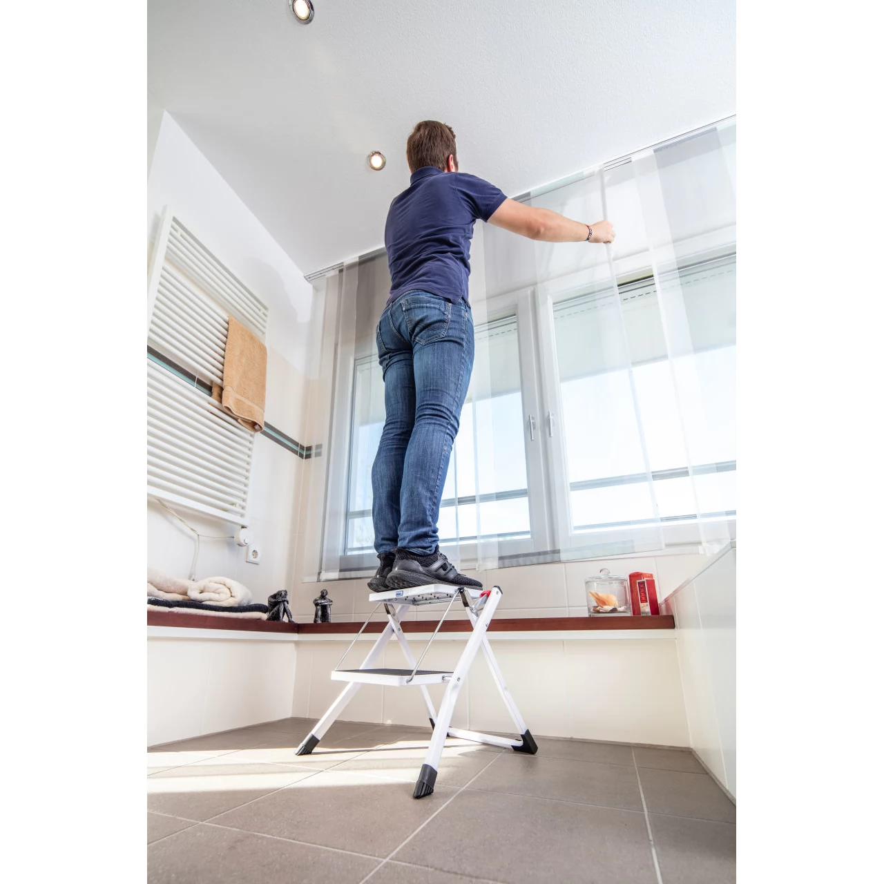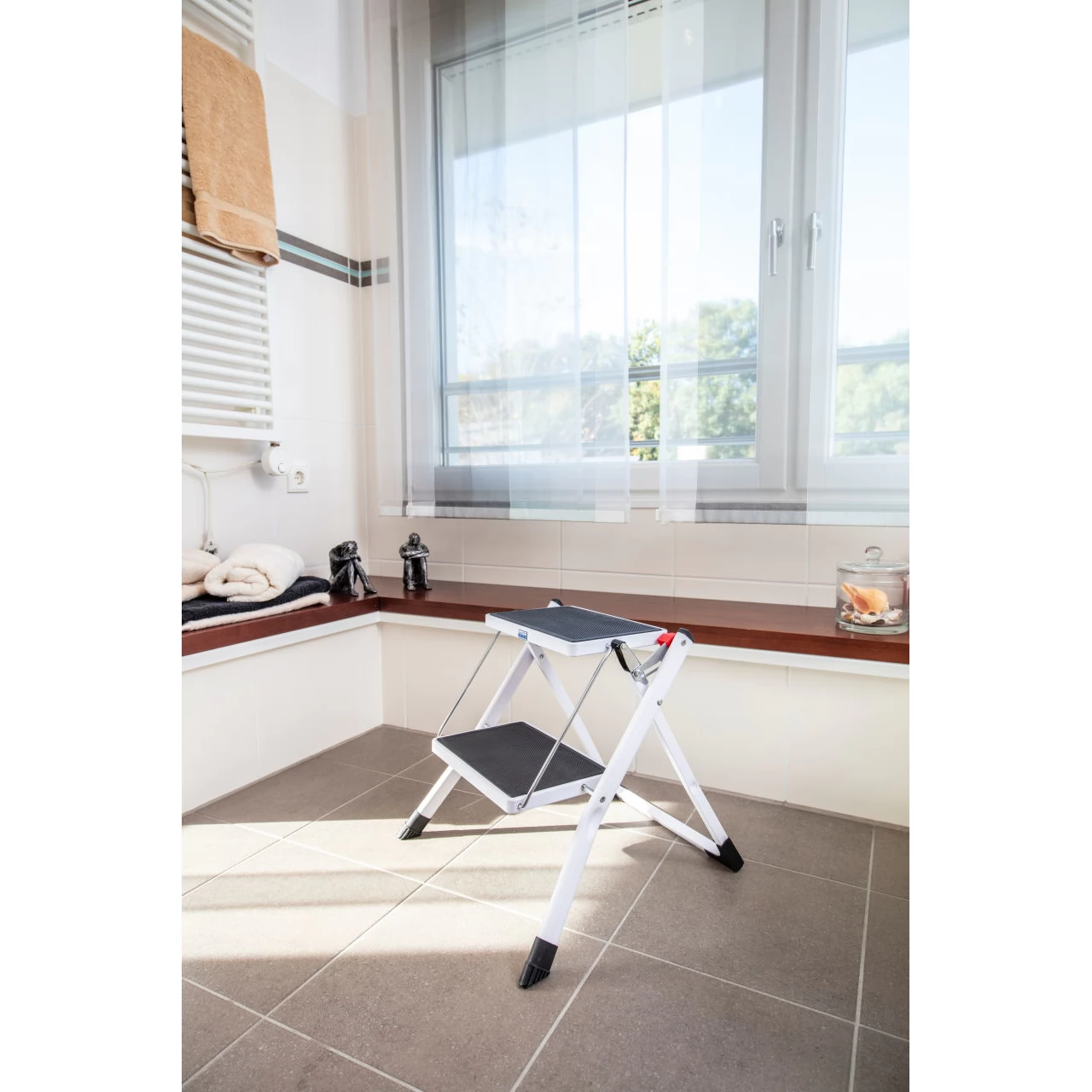 A könnyű és kompakt acél fellépő hordozófogantyúval és kioldógombbal. Két nagy lépcsőfok csúszásmentes betéttel biztosítja a biztonságos feljutást és a stabilitást.