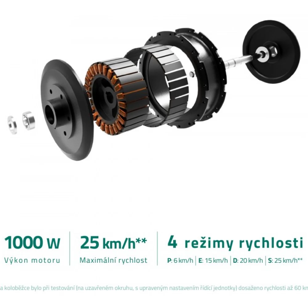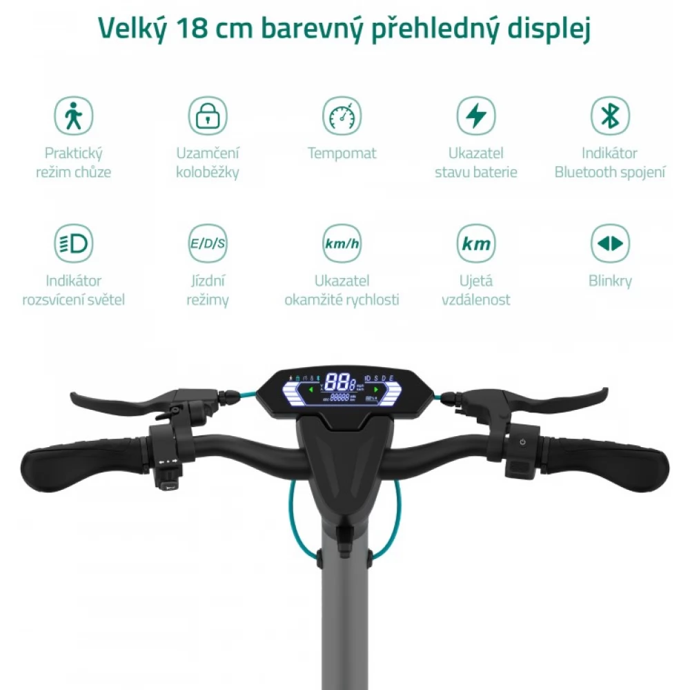 - Biztonsági funkciók Hangos riasztó kerékreteszeléssel, nem kívánt indítás elleni védelem, automatikus LED világítás rossz látási viszonyok között, lassabb ECO mód kezdőknek és energiatakarékosság, meghosszabbított kormány, hosszú és széles futódeszka, mindkét kerék állítható felfüggesztése, irányjelzők, csengő, kürt, a robogó Bluetooth-hozzáférésének jelszóval történő aktiválásának lehetősége