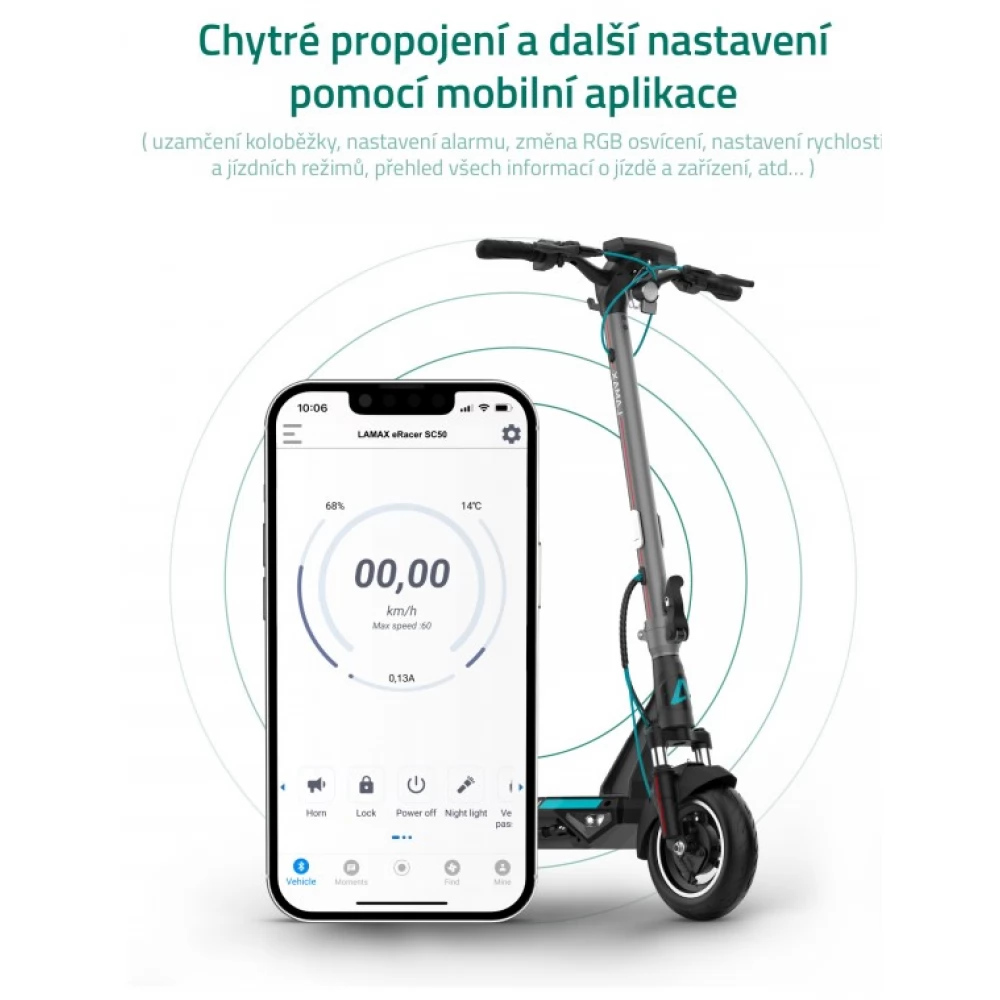 Egy gyors pillantással teljes áttekintést kaphatsz az utazásról és az elektromos roller állapotáról. A színes LCD kijelzőn mindent láthatsz, hiszen kijelzi a sebességet, a megtett kilométereket, az akkumulátor töltöttségi szintjét, valamint azt is, ha a lámpák fel vannak kapcsolva. A LAMAX eRacer SC50 elektromos roller használati módját is könnyen megváltoztathatod. Például aktiválhatod a Séta üzemmódot,amelyet a meredek dombokon fogsz értékelni. Ha szeretnél a beállításokkal kísérletezni, letöltheted a mobilalkalmazást, és beállíthatod az elektromos roller összes funkcióját, hogy megfeleljen számodra. A rollert az alkalmazáson keresztül lezárhatod, amely hangos riasztás jelez, ha valaki megpróbálja ellopni.
