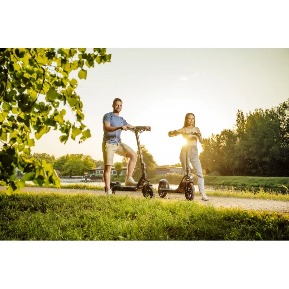 A LAMAX elektromos roller nagy, 10 hüvelykes kerekekkel rendelkezikaz A-ból B-be történő kényelmes eljutás érdekében. A széles platformon kényelmesen egymás mellé helyezheted mindkét lábad. A robusztus kormány és a kiváló minőségű felfüggesztés jó kezelhetőséget és kényelmet biztosít még egyenetlen talajon való közlekedés során is. A LAMAX eRacer SC50 elektromos roller megbízhatóan állítható meg a tárcsa, a dob és az elektronikus fékek kombinációjával. Ha sötétedni kezd, vagy éjszaka használod, értékelni fogod a nagy teljesítményű LED-es fényszóró és az állítható színű LED-es oldalsó világítás jelenlétét. A világítás automatikusan bekapcsol, ha szürkületben vagy alagútban vezeted. Használd a LAMAX elektromos roller irányjelzőit, hogy jelezhesd környezetednek az irányváltást. a csengővel pedig figyelmeztetheted a környezetedet az érkezésedre.