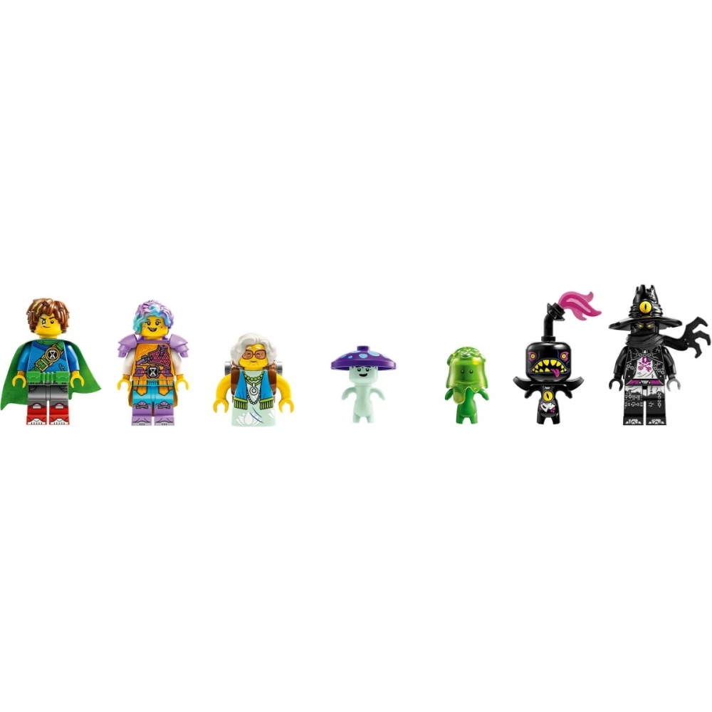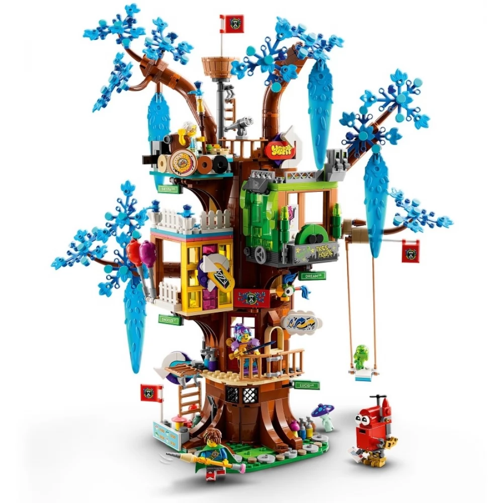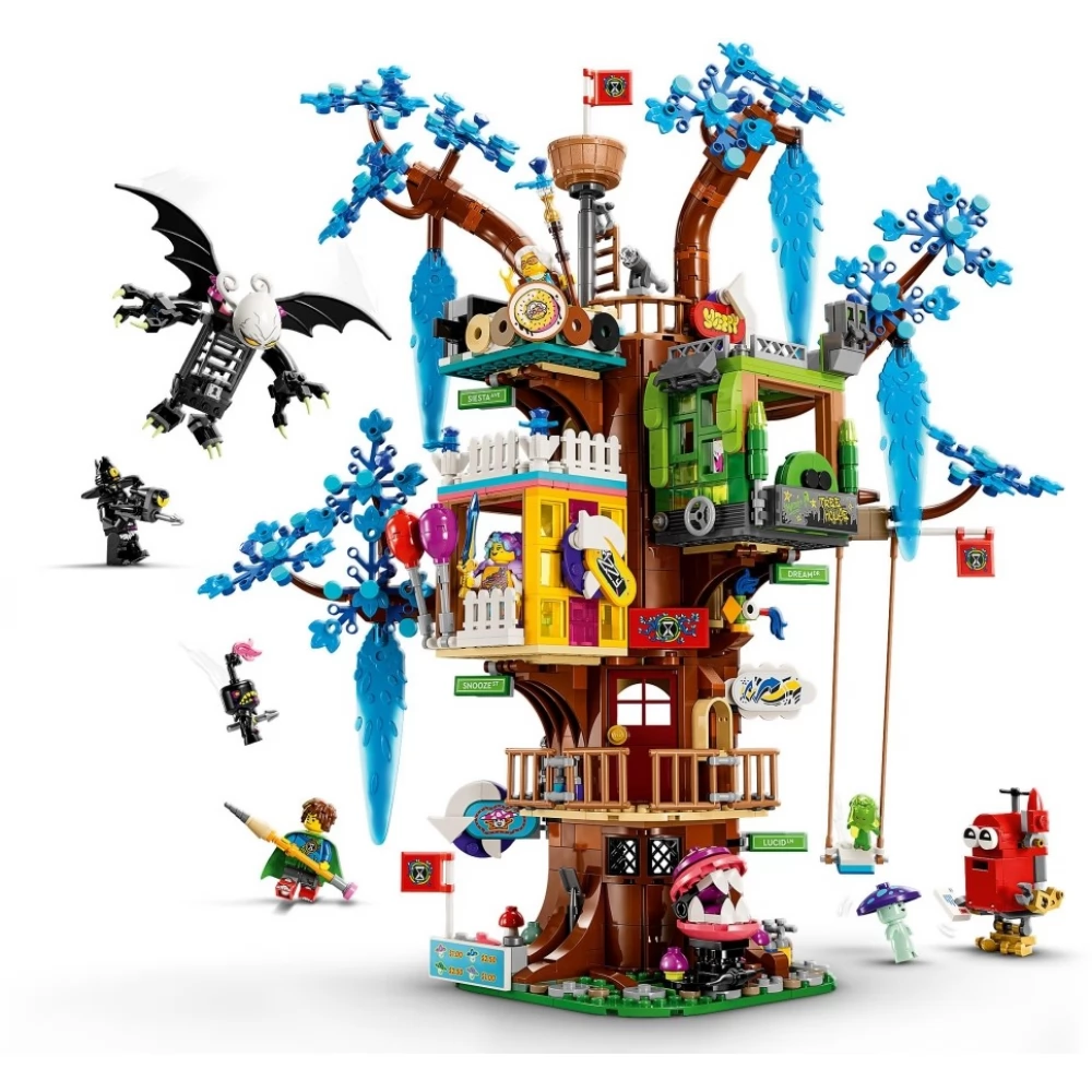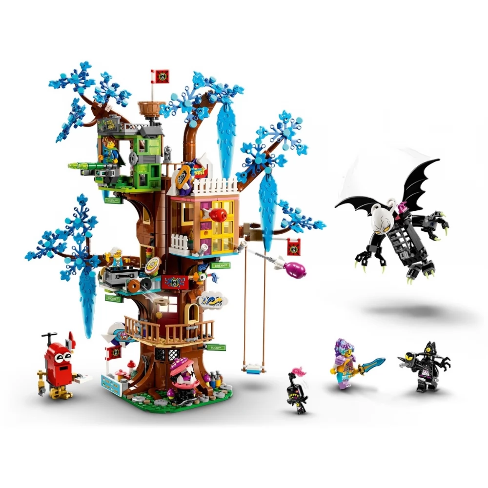 A varázslatos lombház az az építmény, ahol a DREAMZzz hősei összegyűlnek. Az készlet 3 részből áll: Mrs. Castillo konyhája, Izzie és Mateo hálószobája és egy nappali, plusz egy őrtorony és egy vagány hinta. 1 lombház, 2 építési mód A lombház partymódban és védekező módban is megépíthető, így hosszú órákon át tartó szórakozást nyújt, és a gyerekek saját kalandokat élhetnek át. Megépíthetik a lombházat egy laza találkahelynek, de felkészülhetnek a védekezésre is, hogy megvédjenek egy álmodót és a hősöket a rémálomlényektől. Lenyűgöző részletek A menő részletek közt megtalálod Mrs. Castillo kenyérpirítóját, ami bégelkilövővé változik, valamint Mateo álomfestékes üvegeit, amelyek szerteszét hevernek a lombház körül. Ezeket az elemeket a főbb karakterek minifigurái, Mrs. Castillo, Izzie, Mateo és az Éjvadász keltik életre.