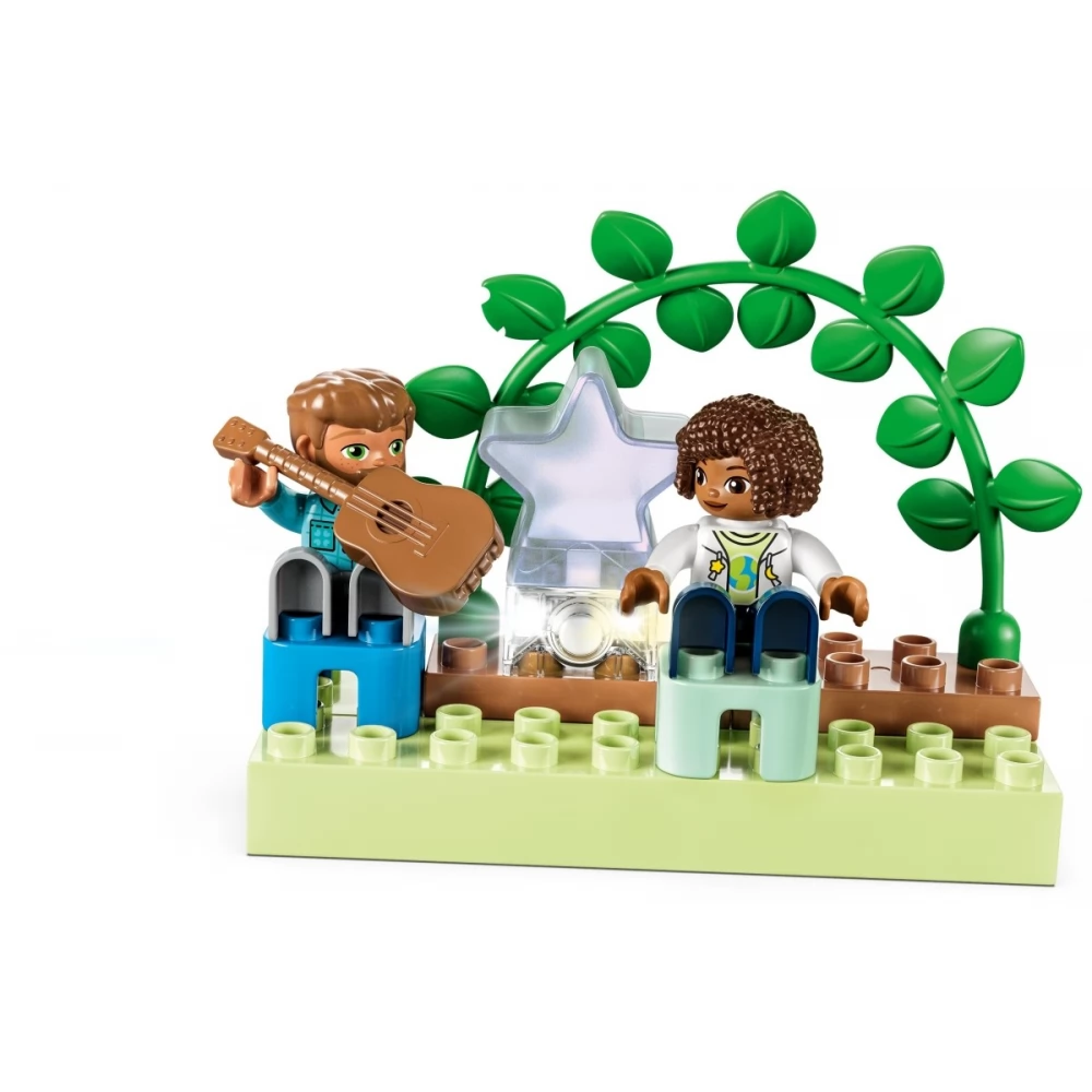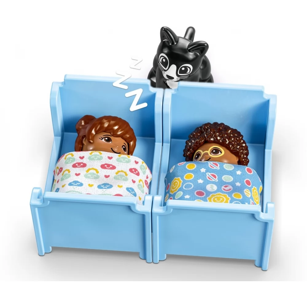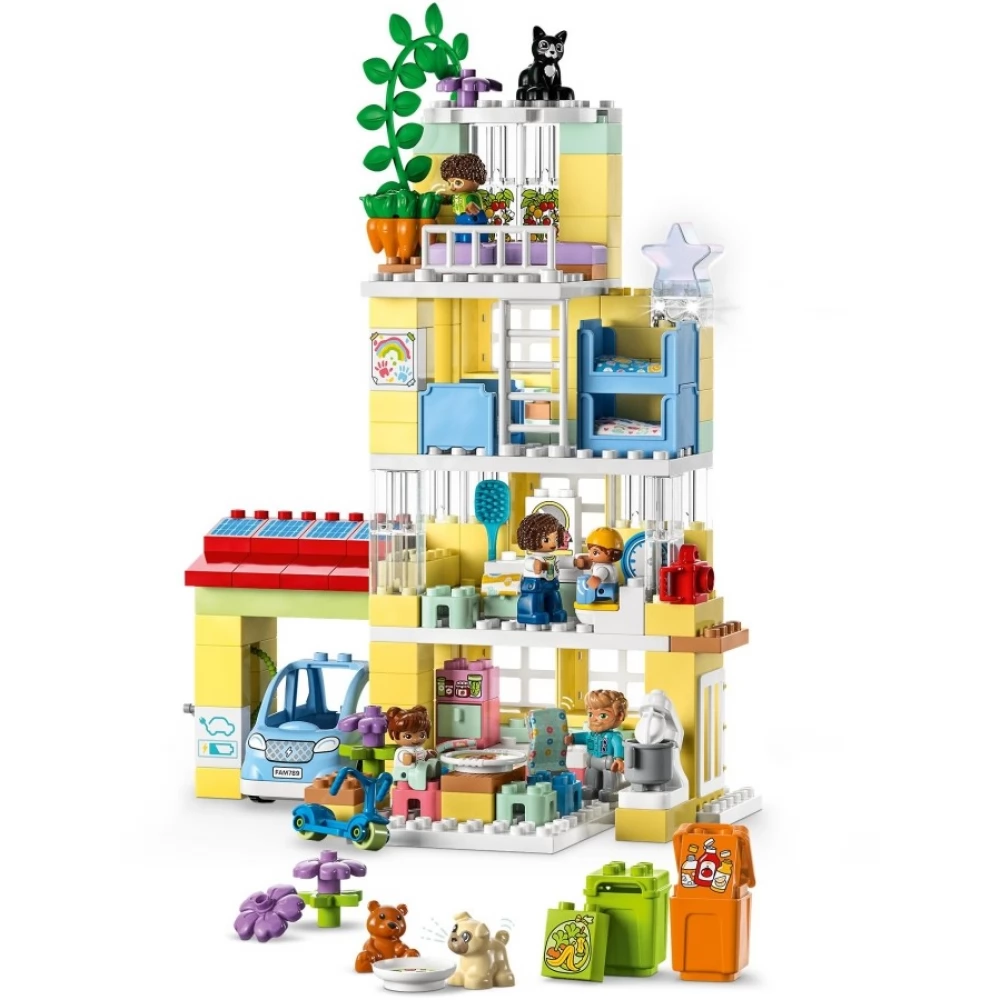 Üdvözlünk titeket a LEGO Duplo Városi kalandok 3 az 1-ben családi házban (10994), ahol a gyerekekre a tanulás mókás világa vár! A valósághű részletekkel teli ház segítségével a 3 éves vagy nagyobb gyerekek és szüleik játék közben értékes családi pillanatokat élhetnek át együtt. A 7 figurával a szülők is nagyszerűen fognak szórakozni, miközben társas készségeket tanítanak gyerekeiknek, a kicsik pedig felfedezhetik az önkifejezést. Gyerekeknek, akik imádják a játék házakat Ez a játék ház rengeteg sokszínű, iskoláskor előtti tanulási lehetőséget rejt. A gyerekek eljátszhatják a lefekvési rutint, köztük a fogmosást és az esti meseolvasást is, miközben bebújnak a paplan alá az emeletes ágyban, ahol a csillaglámpa világító elemével otthonos hangulatot teremthetnek. Emellett megismerkedhetnek az egészséges ételekkel a konyhában, vagy paradicsomot és répát szedhetnek a kertben. A garázsban pedig egy megépíthető, Told és Indul elektromos autó vár rájuk, amit napelemekkel tölthetnek fel, így igazán eseménydús játék vár rájuk. Igazán kreatív építés A házat 3 módon is megépíthetitek, így sosem lesz unalmas a játék. A gyerekek építhetnek egy nagy, 3 emeletes házat, egy magas épületet vagy 2 kisebb lakóházat, amiket egy kert köt össze.