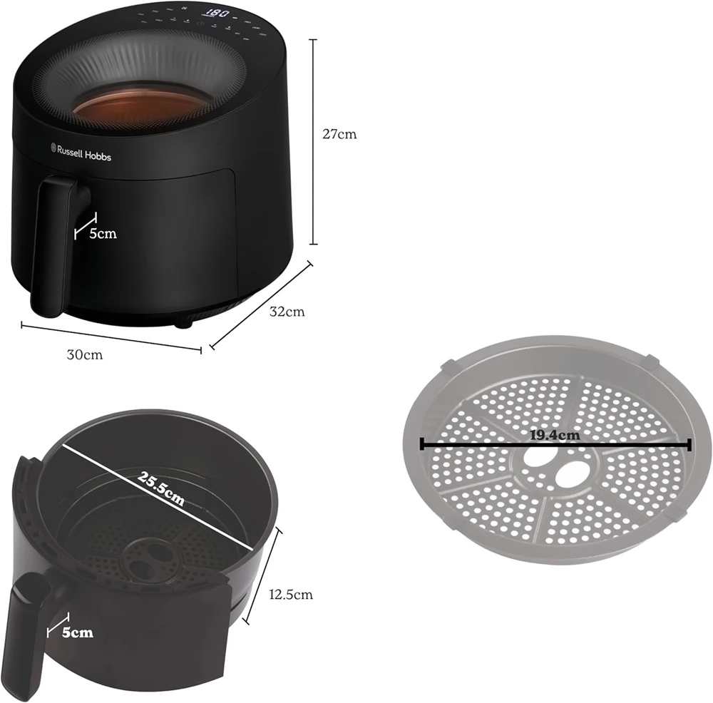 Legyen szó családi vacsoráról, hétköznapi étkezésről vagy egy gyors nassolnivalóról, a Russell Hobbs Panoramic fekete színű airfryer 10 választható főzési/sütési programot kínál: légkeveréses sütés, sütés, pirítás, grillezés, újramelegítés, hasábburgonya, csirke, zöldség, hal és steak.