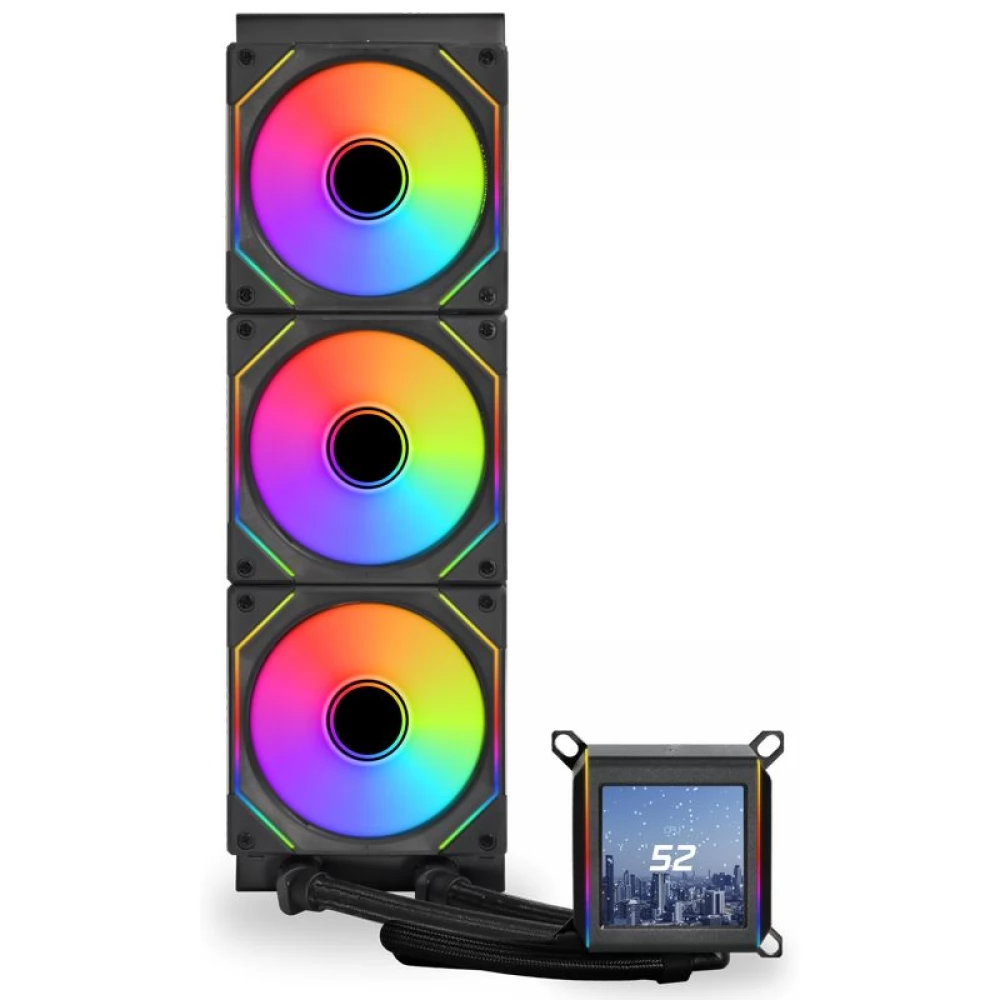 Kompakt, univerzális vízhűtés 3 darab 120mm-es vezérelhető ARGB világítású és PWM sebesség szabályzású ventilátorral és CPU vízhűtés blokkal. A CPU vízhűtés blokk nemcsak a megszokott vezérelhető ARGB világítással rendelkezik, hanem egy 2.88" méretű, 480×480 felbontású IPS LCD kijelzőt is, amin valós idejű rendszerinformációk, tetszőleges szöveg, idő stb. jeleníthető meg. A hűtés további különlegessége, hogy a csövek csatlakozásai forgathatóak ami könnyebb beépítést tesz lehetővé a különböző kialakítású házakba.