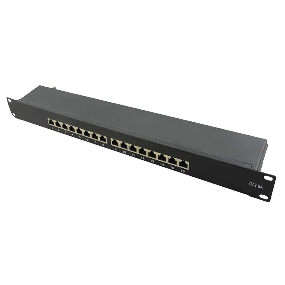 LOGILINK Cat.6A patch panel 16-port STP. fekete. teljesen árnyékolt