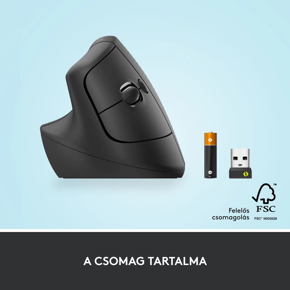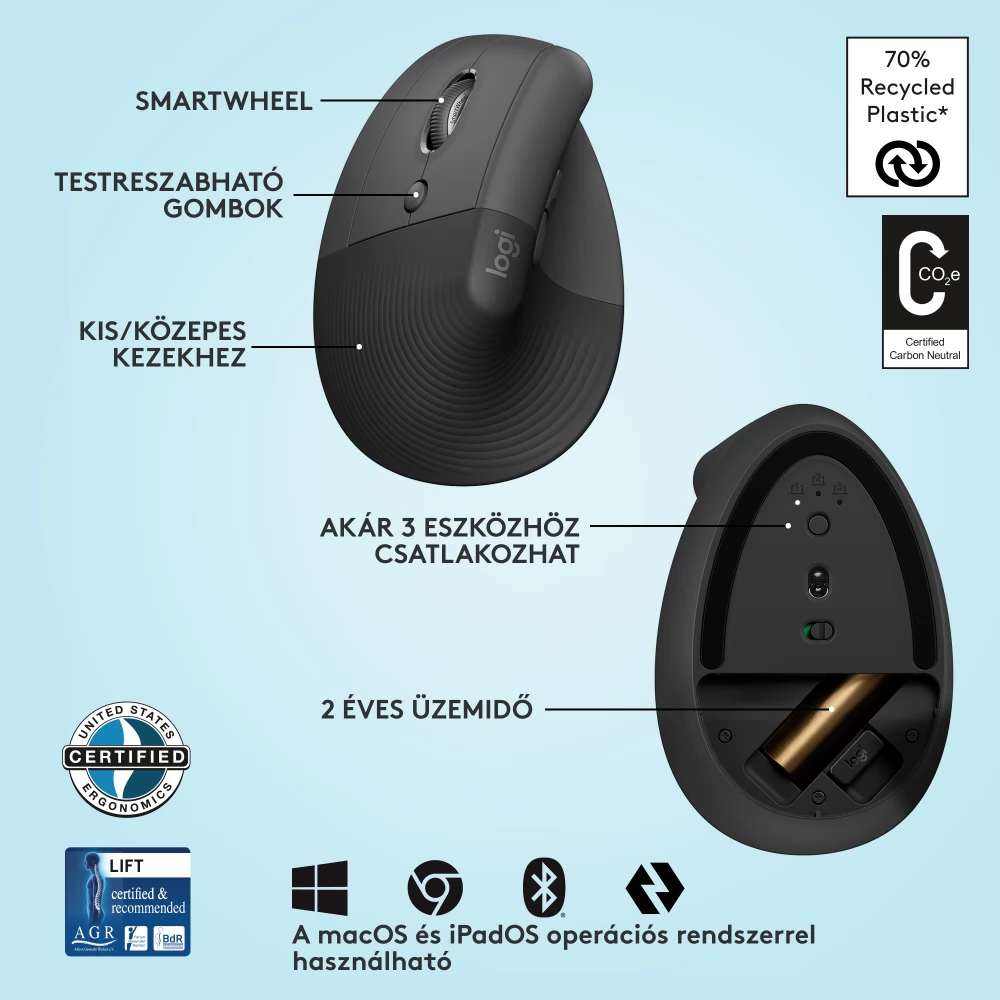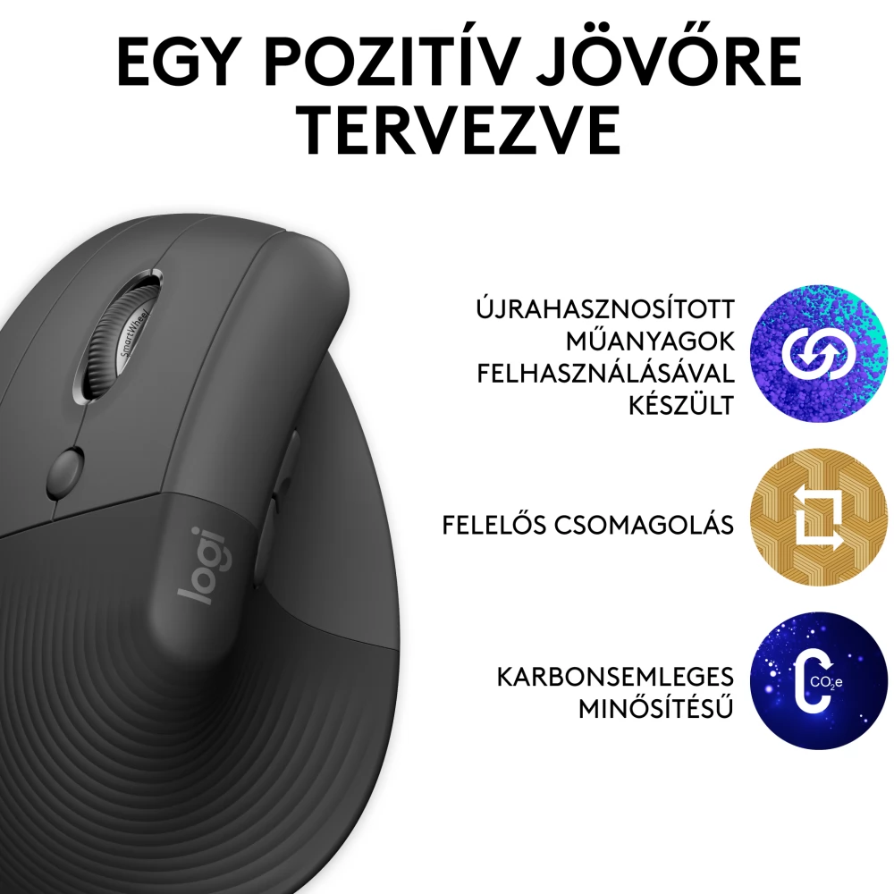 A LOGITECH Lift Left for Business Vertical Ergonomic grafit színű egér vezető ergonómiai szakemberek által tervezett, fejlesztett, tesztelt és jóváhagyott termék. Javítja a testtartást, csökkenti az izomtevékenységet és enyhíti a csuklóra nehezedő nyomást. A Lift organikus sziluettje kesztyűként illeszkedik a tenyérhez, ívelt formájával a kéz optimális 57°-os szögben helyezkedik el, mely javítja a kényelmet és a hatékonyságot. Emellett javítja a felhasználók élményét és közérzetét is.