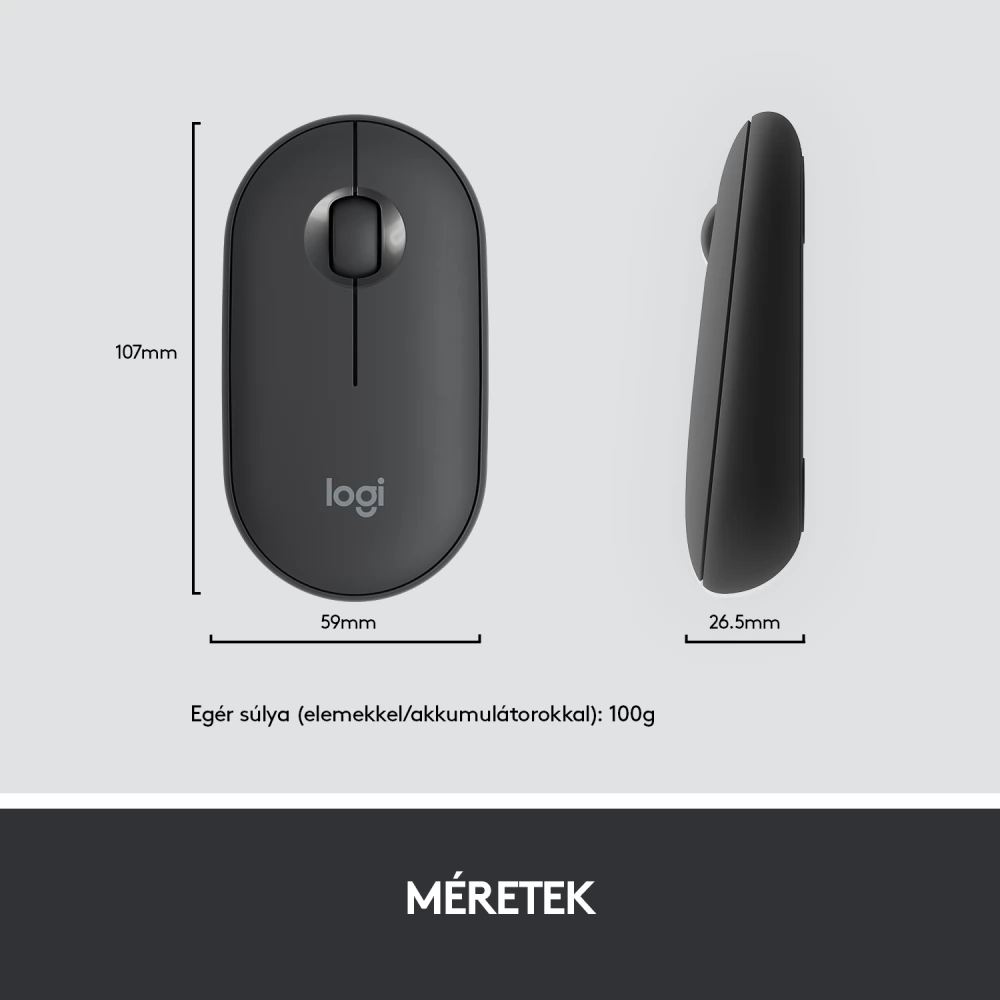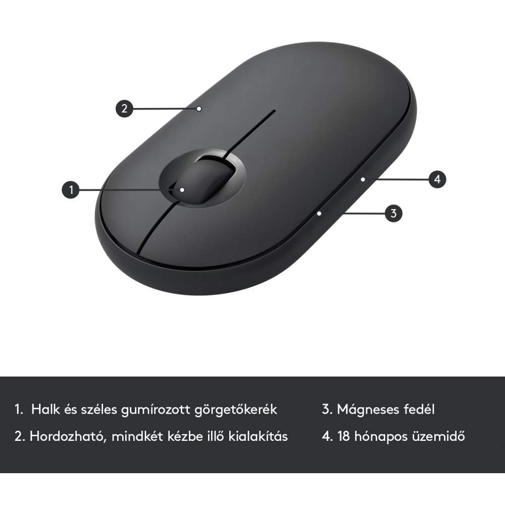 Az alacsony profilú, ollós mechanikával működő billentyűk kellemes és jól ismert laptop-szerű gépelési érzetet nyújtanak. A mindkét kézzel használható, sima kavicsforma kellemesen simul bármelyik tenyérbe.
