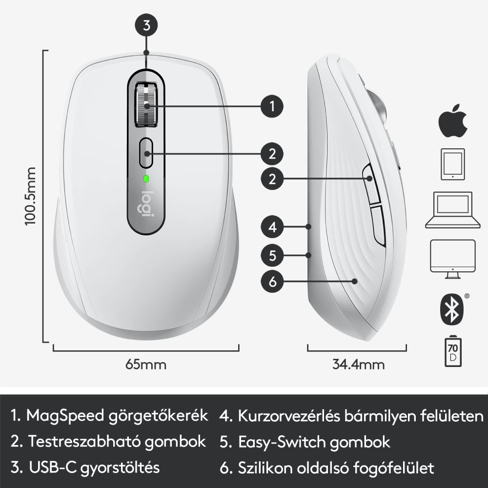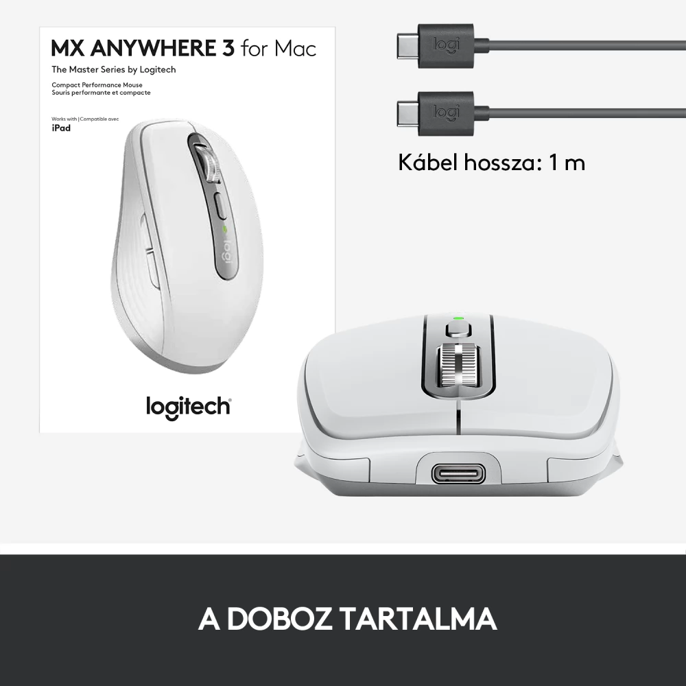 A Mac-felhasználók szem előtt tartásával lett tervezve, kifejlesztve és kialakítva. Elegáns halványszürke színével a Machez készült MX Anywhere 3 tökéletesen illeszkedik az iMac, MacBook és iPad készülékekhez. Továbbá iPadOS-kompatibilis, vagyis az iPad számítógépként vagy többkészülékes összeállítás részeként történő használata esetén kihasználhatja az MX hatékony funkcióit. Az USB-C – USB-C töltőkábellel közvetlenül összekapcsolható a Mac számítógéppel, mindenféle ormótlan csatlakozóeszközök nélkül.