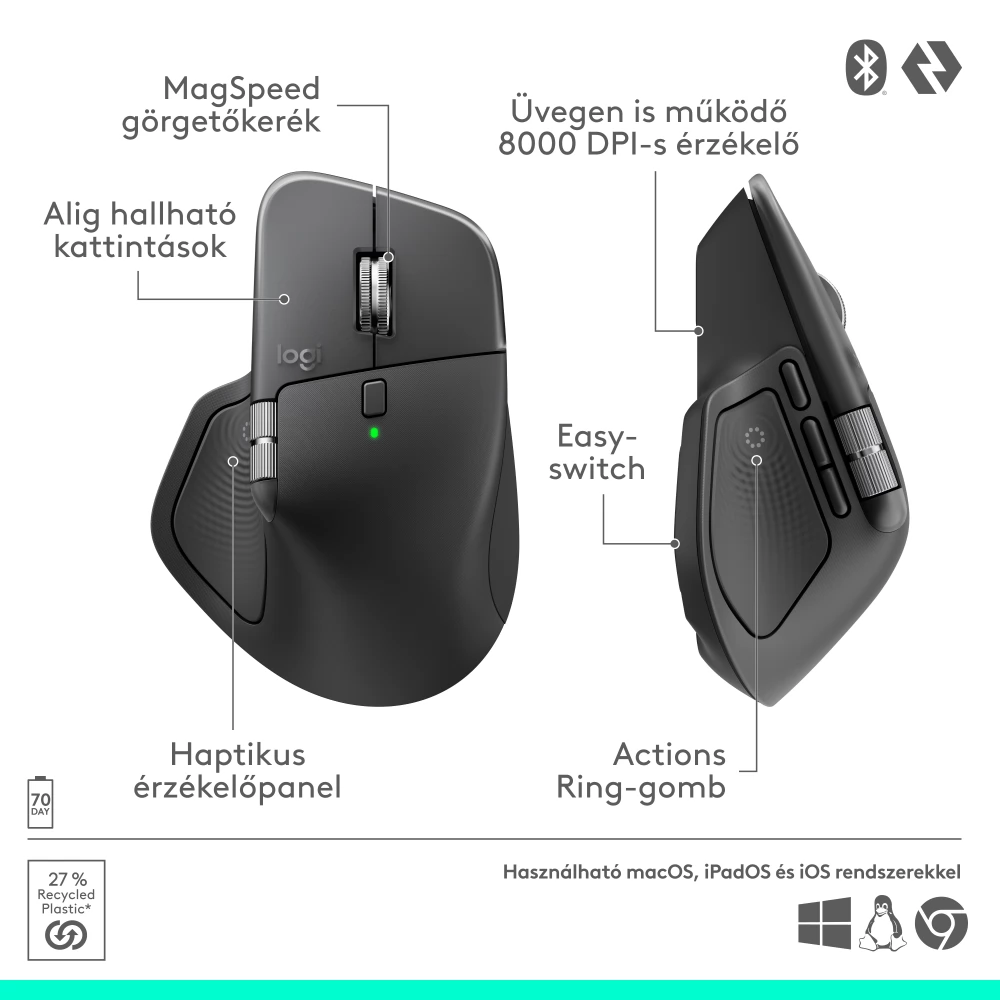Logitech MX Master 4 ergonomikus vezeték nélküli egér nagy teljesítményű haptikus visszajelzéssel, ultragyors görgetéssel, USB-C-töltéssel, Bluetooth-szal.