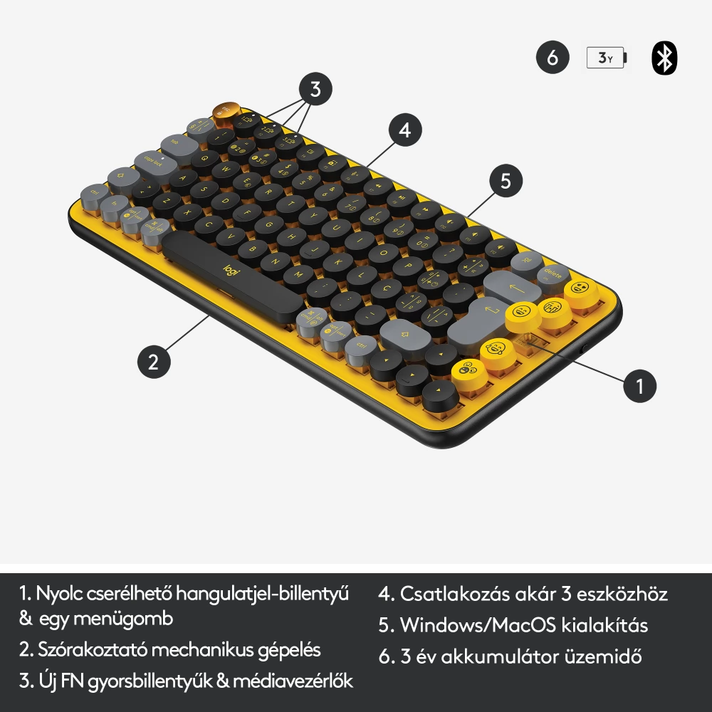 LOGITECH POP Keys Blast Vezeték nélküli bluetooth billentyűzet Német kiosztás Sárga/Fekete