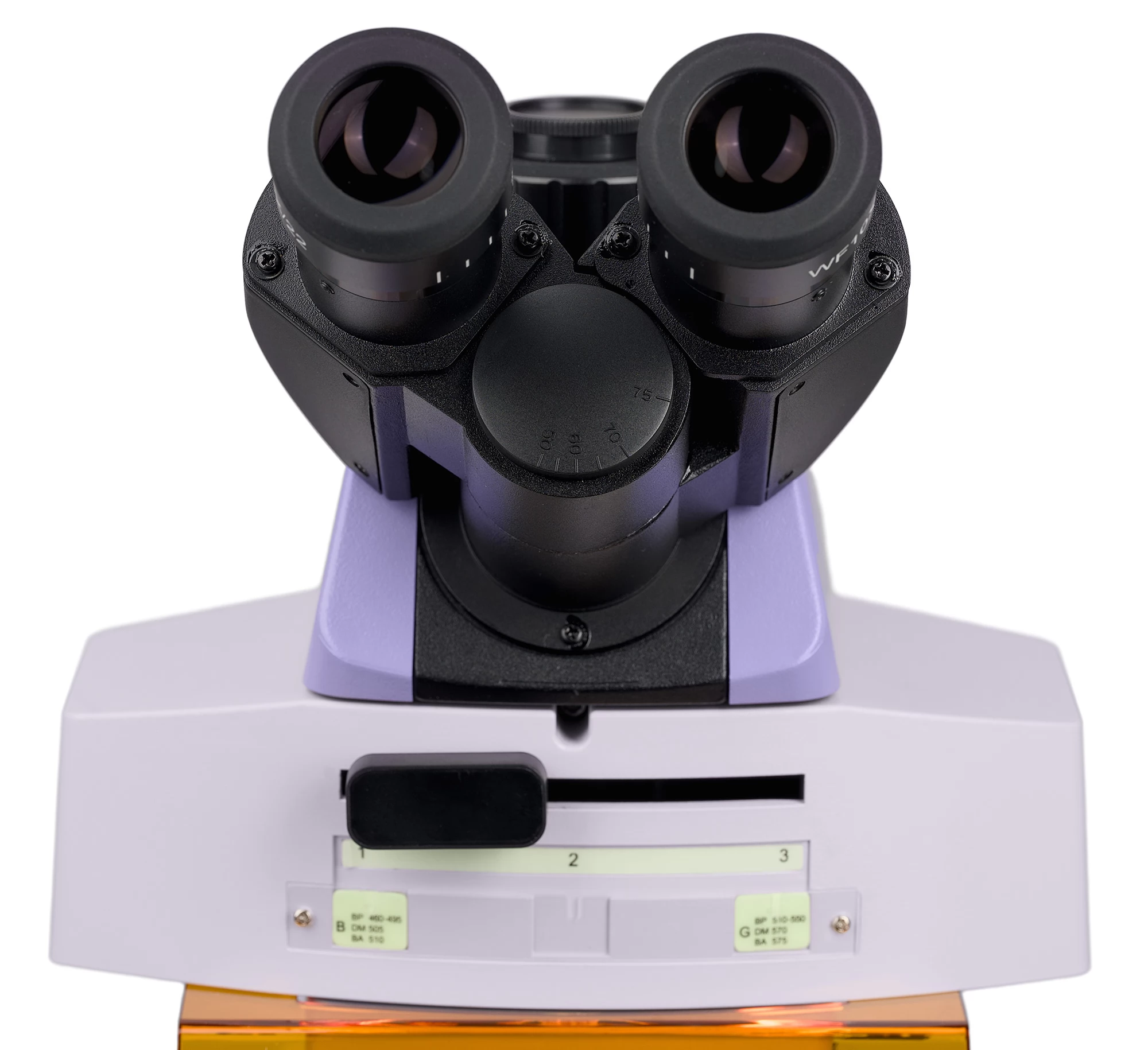 A lumineszcencia gerjesztéséért felelős fényforrások 3 W-os LED-izzók, illetve a lumineszcencia két hullámhossztartományát átengedő szűrők: kék (B) és zöld (G). A fényvisszavert fényű világítás kapcsolójának bal vagy jobb állásba állításával lehet váltani az aktív szűrőt. A kapcsoló középső állása a világos látóterű technikának felel meg.