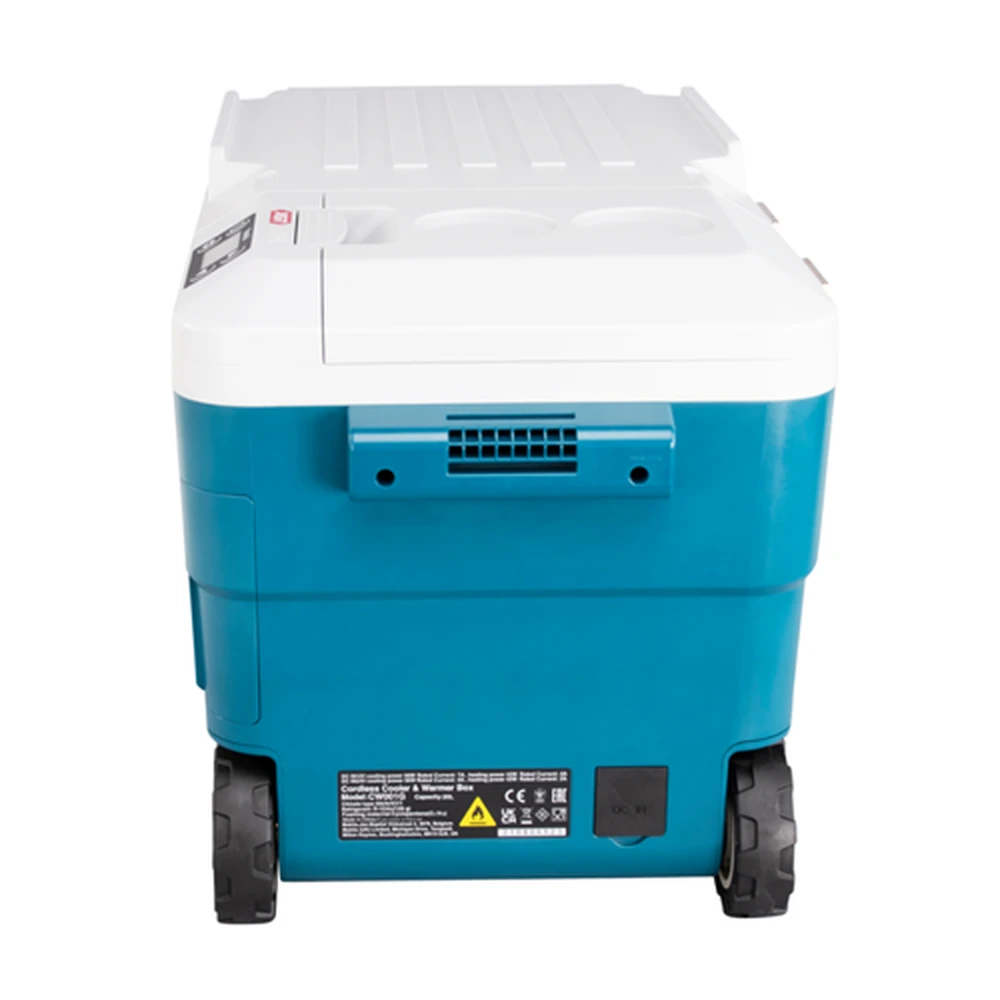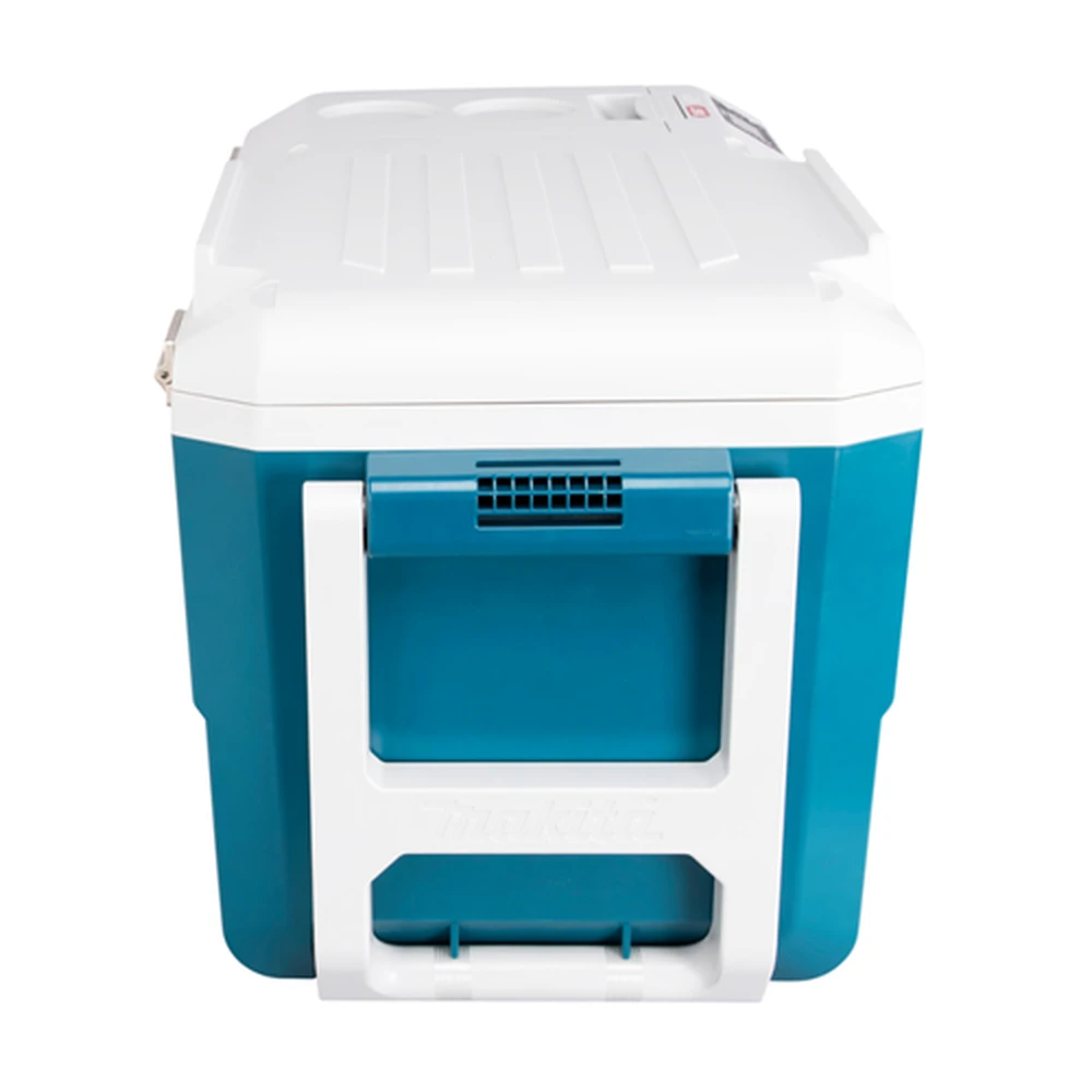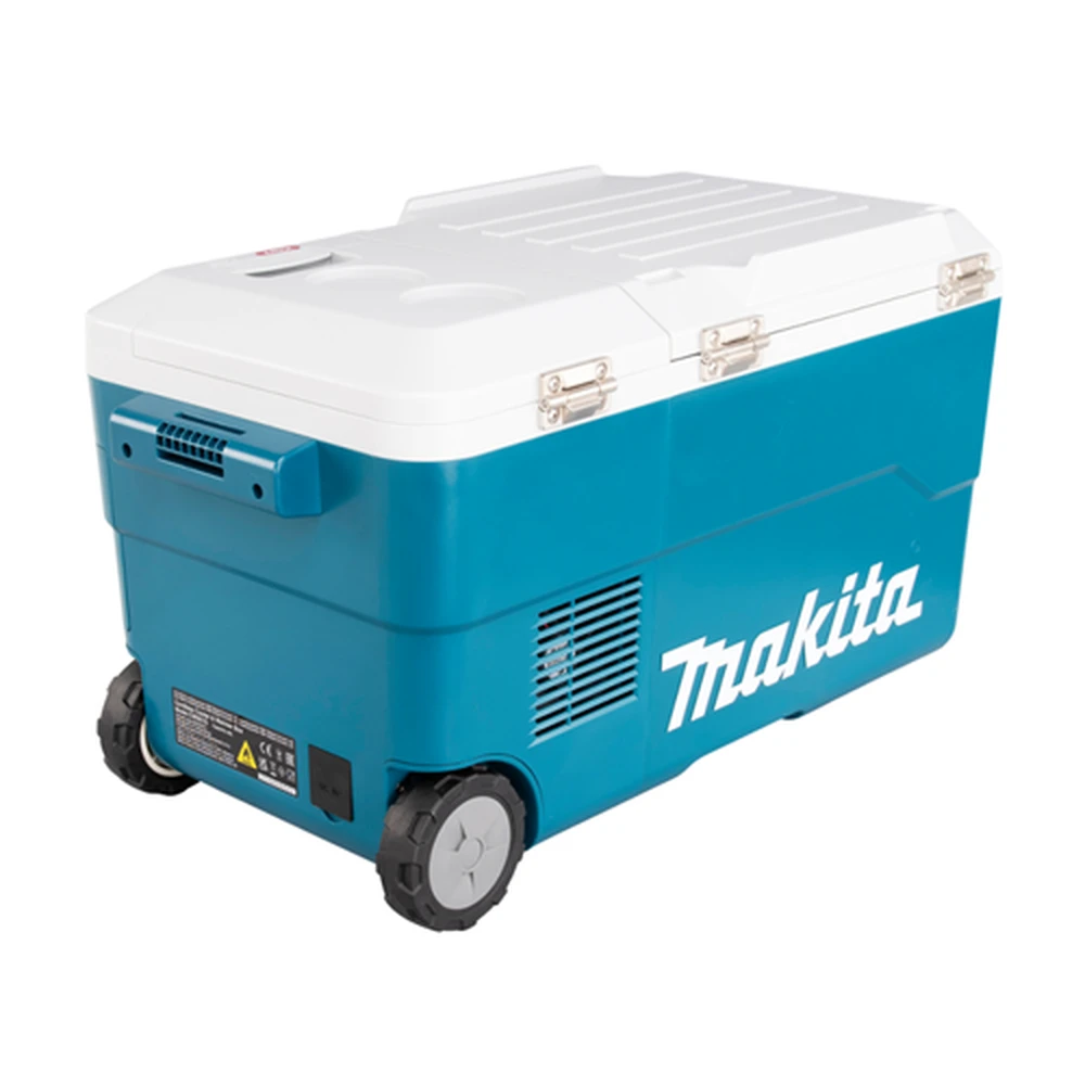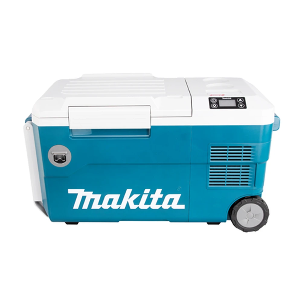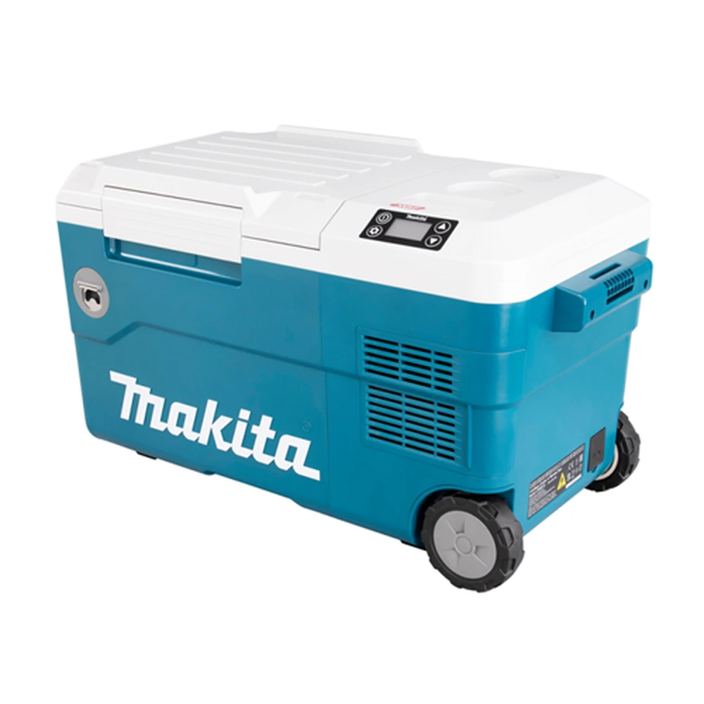 hordozható hűtő-fűtő doboz négyféle áramforrással egyaránt üzemel 40Vmax XGT® - 18V LXT® (2db egyszerre) - szivargyújtóról és normál hálózatról. A hűtés kompresszorral történik - 7 fokozatban állítható -18/-15/-10/-5/0/+5°C a fűtés szintén 7 fokozatban 30/35/40/45/50/55/60°C. Nagyméretű 20 literes tartályban 4db 2 literes vagy 20db 0.5 literes palack helyezhető el. Az üzemidő 2db BL4050F akkumulátorral -18°C-on 10 óra +60°-on 8.5 óra. A könnyű szállítás miatt oldalmarkolatokkal és kihajtható húzókarral rendelkezik - 10cm átmérőjű hátsó kerekeken gurítható. Az akkumulátor tartó doboz fedele véd a ráfröccsenő víztől. Az itt elhelyezett 2.4A USB töltő telefonok töltésére ideális. A beállítások gombokkal módosíthatóak - nagy LED kijelzőn jelennek meg a hőmérséklet és akkumulátor kapacitás adatai. A doboz oldalán sörbontó található. Hálózati adaptert nem tartalmaz - külön rendelhető WL00000122 cikkszámon.