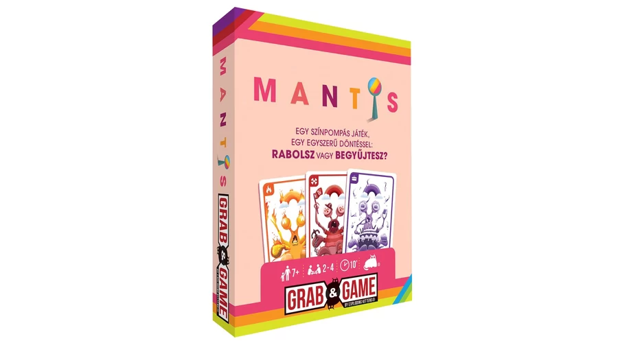A Mantis egy villámgyors, vidám, egyszerűen tanulható kártyajáték, amelyben minden körben döntened kell: megtartod a lapot, és pontokat gyűjtesz, vagy inkább az ellenfeleid kártyáira pályázol? A hátlapokon három különböző szín szerepel, és ha sikerül eltalálnod, hogy a felcsapott kártyán ezek közül melyik látható, az adott színű sáskarákok a tied lesznek. De vigyázz! Ha lopni próbálsz, és rosszul tippelsz, akkor a célpontod jár jól! A döntés rajtad áll: biztonságba helyezed a saját kártyáidat, vagy a többiek pontjaira pályázol?