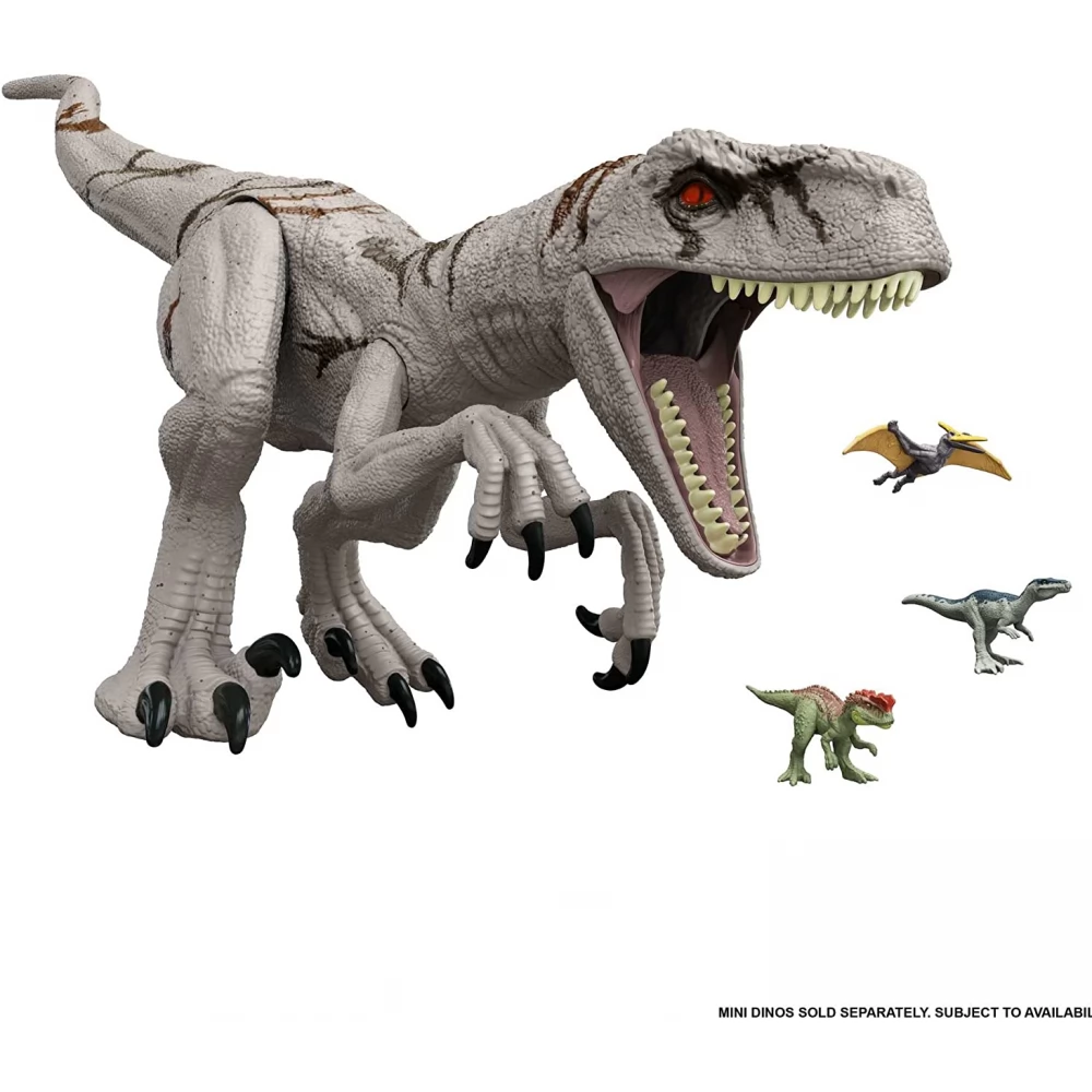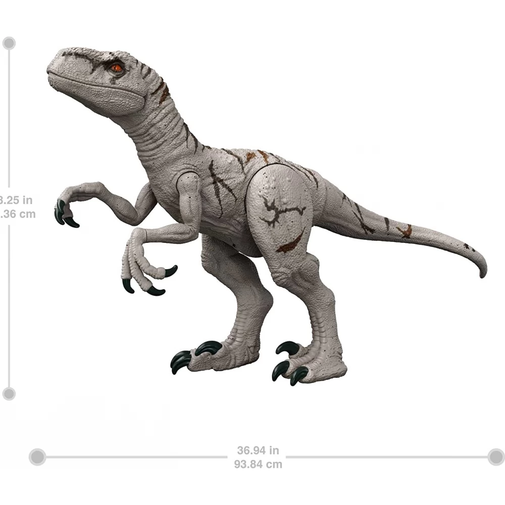 93cm-es, óriás Jurassic World Dominion Super Colossal Atrociaptor dinoszaurusz figura. A figura rejtett támadás funkcióval is rendelkezik amit a farok mozgatásával aktiválhatunk. A figura további különlegessége, hogy a képes a mini Jurassic World Dominion dinoszauruszokat (nem részei a csomagolásnak) elfogyasztani, ezek később kivehetőek.
