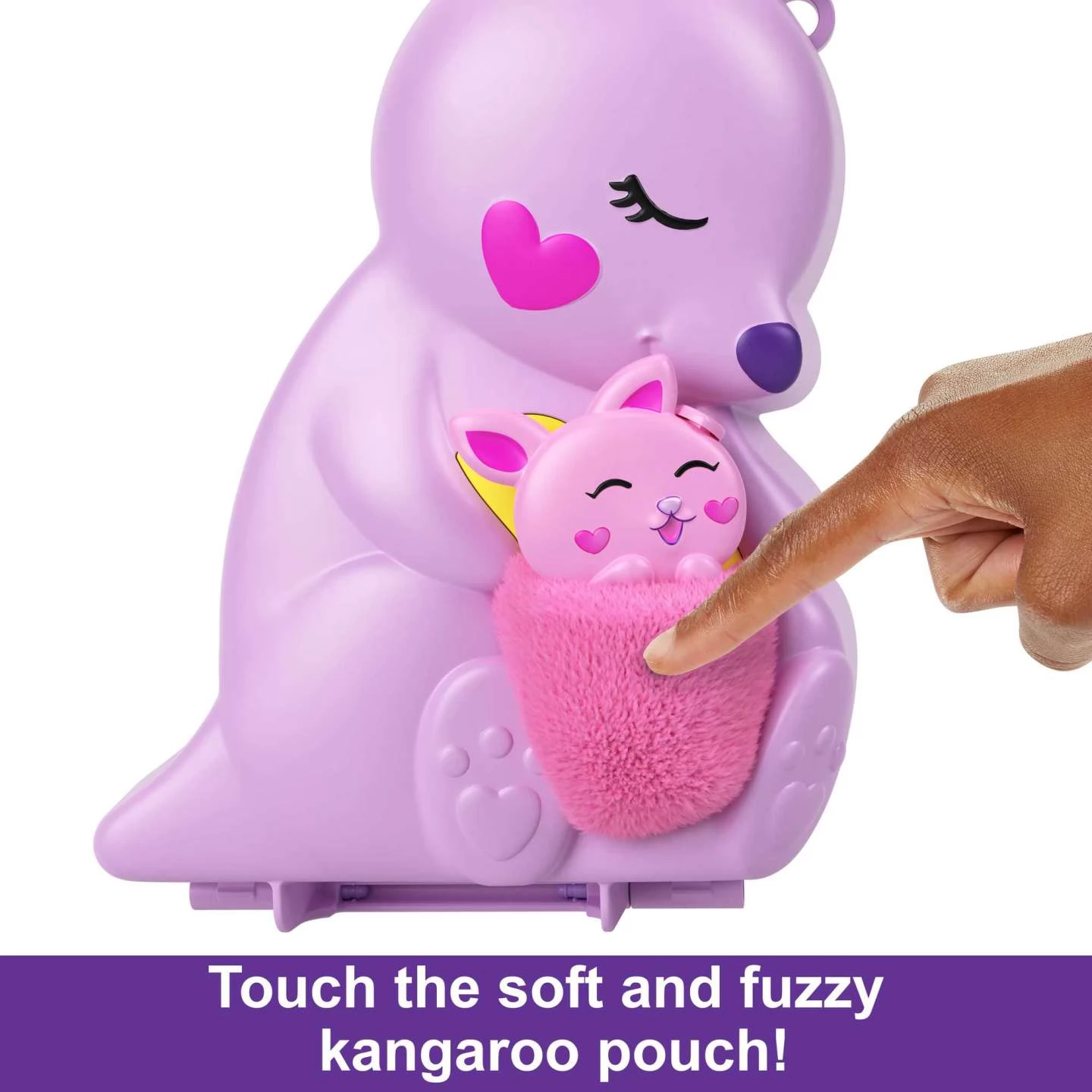 Különleges 2 az 1-ben, kenguru formájú, hordozható Polly Pocket játék készlet 2 darab figurával és állatokkal. A készlet különlegessége, hogy a kis kengurút szétnyitva egy extra, mini játéktéret is kapunk.