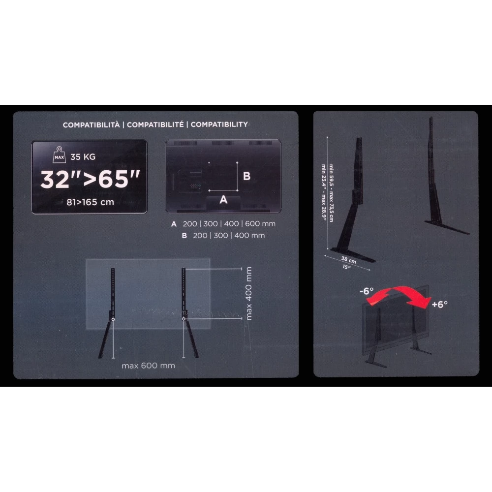 A 3 különböző magasságban történő állítás lehetővé teszi a TV felemelését a felfekvési felületről, a lábak speciális kialakítása pedig lehetővé teszi a képernyő függőleges 6°-os megdöntését.